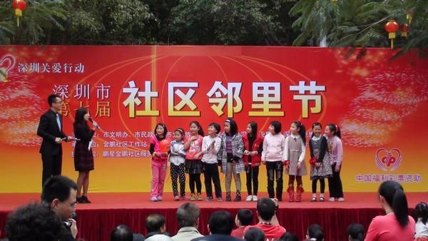 2013年2月24日,值此元宵佳节来临之际,东湖街道三个插花地社区金鹏、金湖、金岭社区,共聚金鹏公园,喜庆深圳市第七届邻里节。东湖街道金鹏社区公园主会场张灯结彩,人流如潮。本次邻里节有来自各社区文体队喜庆的民俗表演,有贯穿整个活动的传统的猜谜活动及元宵汤圆的现场品尝。本次活动特别祟尚环保理念的宣传与倡导。活动中不提供一次性用具,各文体队队员自带水杯,甚至连分吃汤圆的碗用不锈钢小碗代替,以便循环使用。本次活动通过现场派发环保宣传册、主持人对环保理念的倡导、现场义工文明环保的模范引领及节目组对现场小朋友环保小卫士的评选,多角度多层次的引领了环保主流。一场几千人参与的盛会过后,整个公园鲜有白色垃圾。通过这样一个从辖区居民的互动到相邻社区的文化交流的邻里节,更拓宽了邻里的范畴,体现了邻里相亲、邻里互助,文明友爱,环保共建的新风尚。