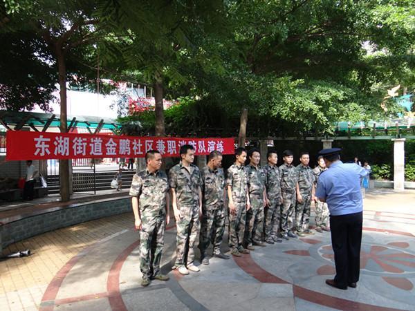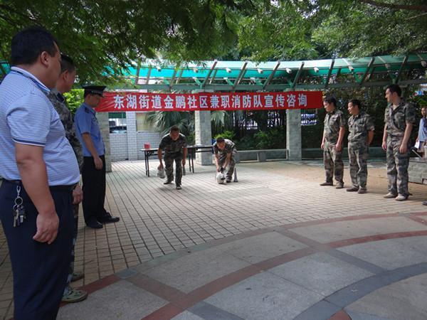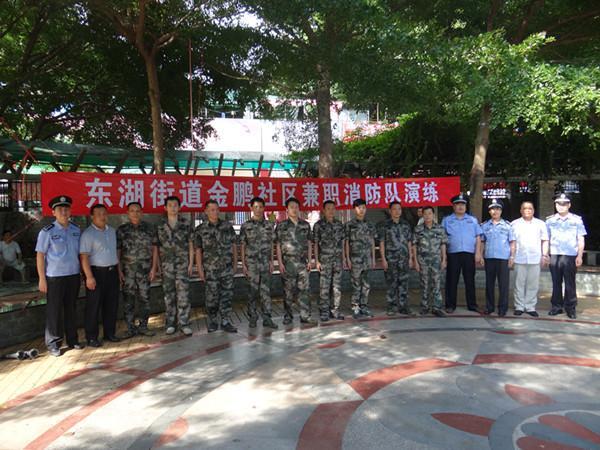 8月8日下午,金鹏社区兼职消防队在东湖派出所副所长张春连和消防组区志华、刘波的指导下开展消防演练。主要内容是如何使用消防器材,演练了如何打水带、初期火源的灭火、燃气瓶的灭火等,共有兼职消防队员10人参加。