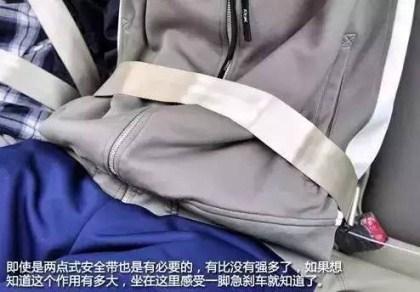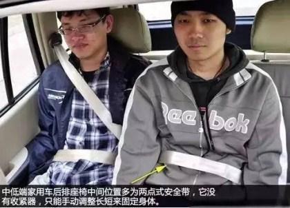 后排座椅的安全带同样重要,虽然后排安全带很少有能调整的,但是总体来说位置还不至于难受,方法和前排的一样。部分车型后排中央位置配备两点式安全带,它没有三点式安全带那么完善,只能固定人的胯骨部分,上半身是无法固定的,在紧急情况下,它能保护乘客避免撞到前风挡。