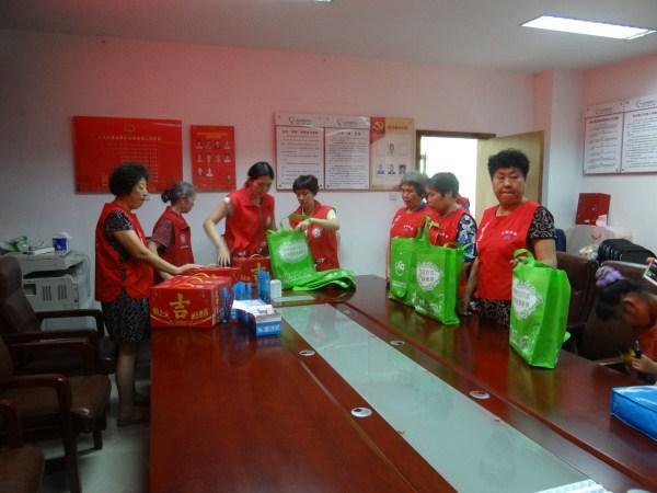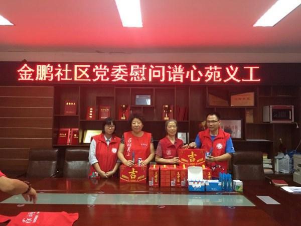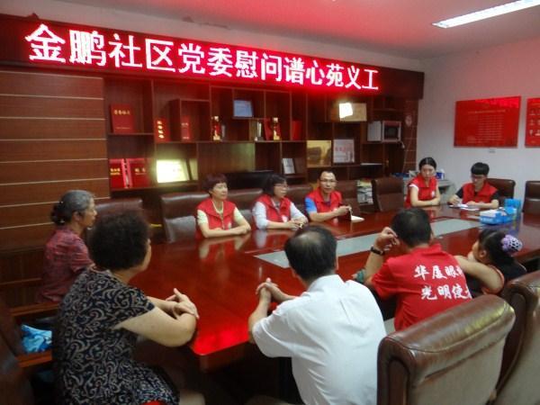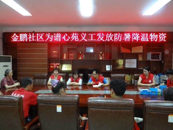 7月14日,金鹏社区党委在工作站二楼会议室慰问了近日来为全国文明城市创建巡查在谱心苑小区及周边的谱心苑义工们,并发放了凉茶、药品等物质。