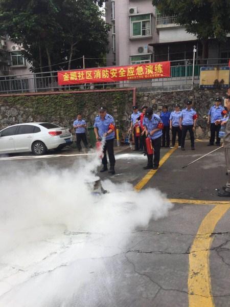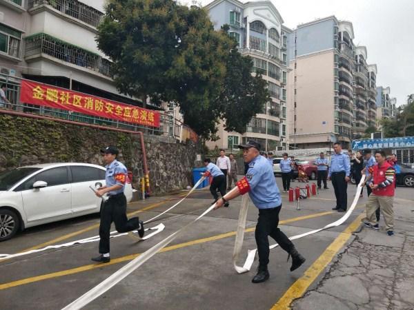 3月19日下午金鹏社区工作站与金鹏社区警务室联合谱心苑管理处一起在谱心苑小区开展消防安全应急演练。