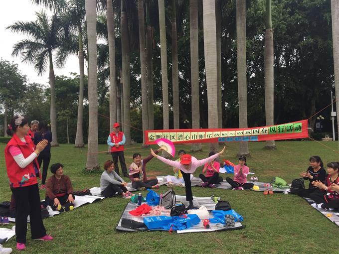 一阵欢快的游戏互动后,社工带领居民们进行户外瑜伽体式练习。居民们在练习中大自然环境合成一体,舒缓身心,放松心情,把一切烦恼都抛在九霄云外。同时,双人瑜伽体式进一步拉近了居民们彼此间的距离。