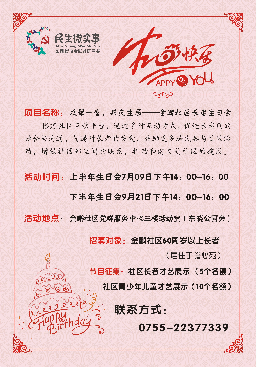 【活动招募】欢聚一堂,共庆生辰--金鹏社区长者生日会