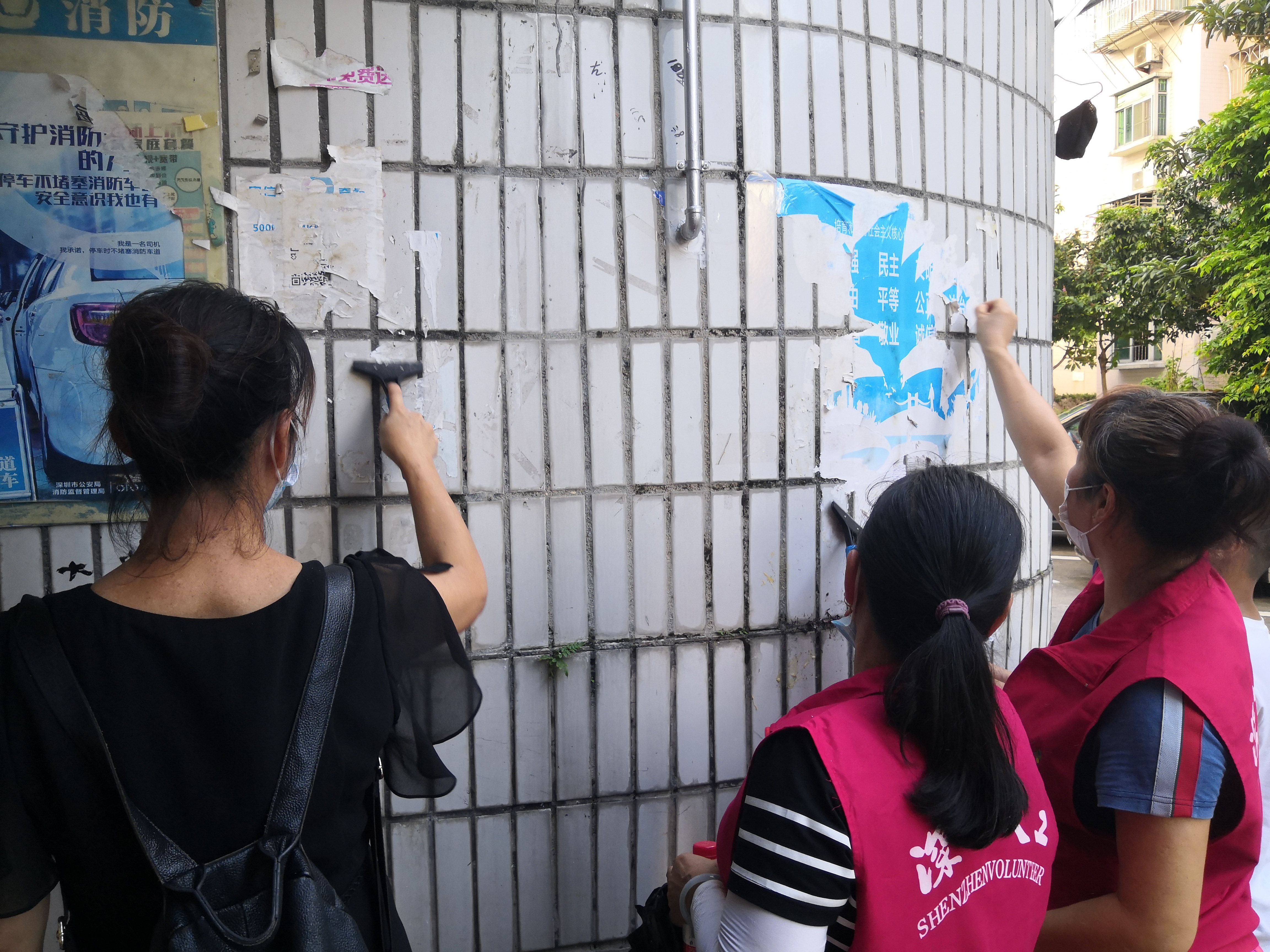 现场工作人员和志愿者们带着铲子、喷壶、小钢刷等工具清理各个卫生死角,仔细铲除辖区内电线杆、墙面上的小广告,对绿化带中的杂草、枯枝、生活垃圾进行细致的分类处理,清洁工作中大人主要负责铲墙面上的小广告,小朋友负责捡垃圾并分类处理,大家分工合作,忙得不亦乐乎。经过大家的共同努力,小区面貌焕然一新,此次清洁卫生活动,得到了辖区居民的高度评价和赞赏,进一步强化了党员的党性意识和为民服务意识,同时也全面提升了城市文明程度和居民文明素质,为创建第六届文明城市再献绵薄之力!