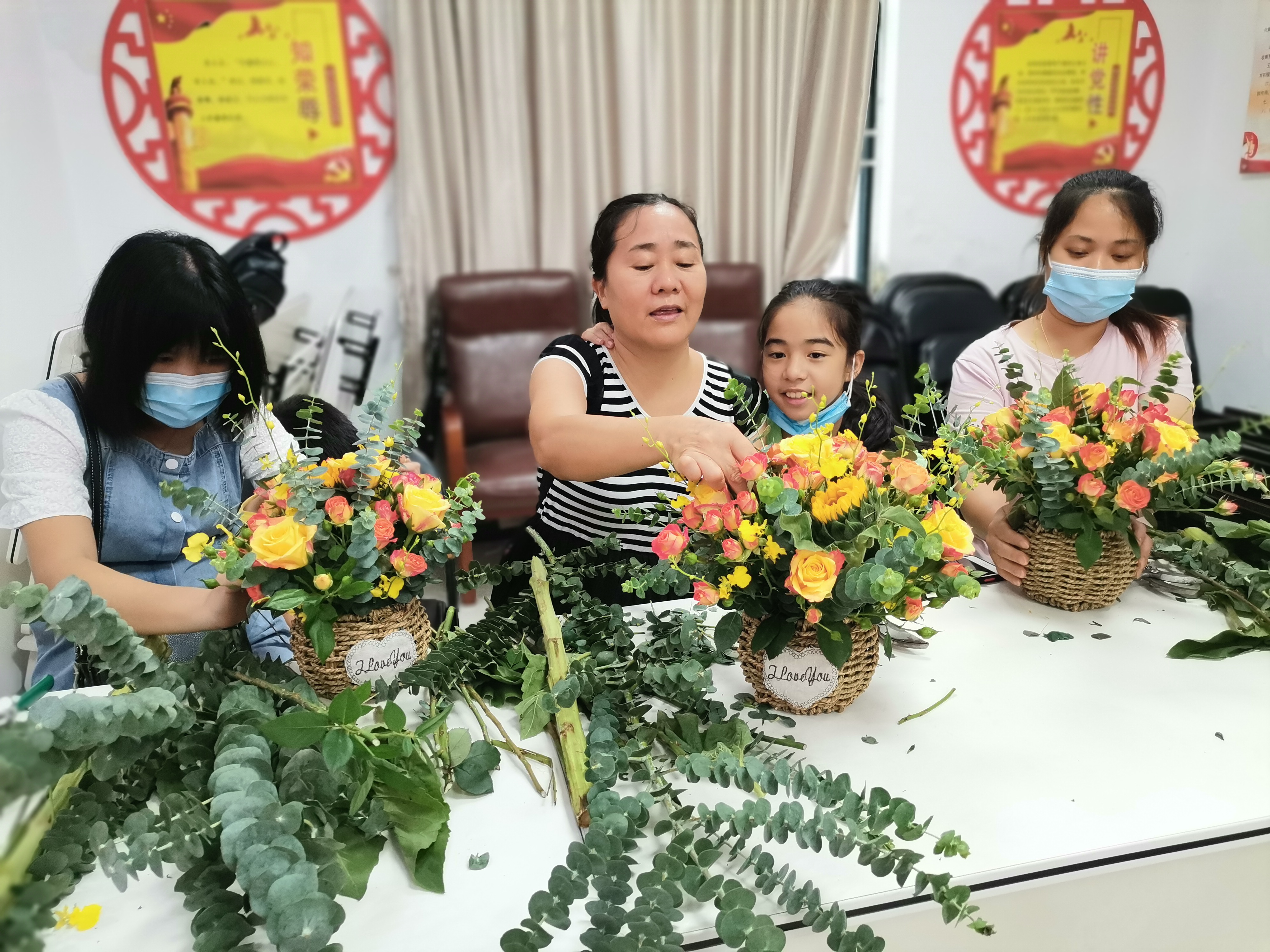 很快,通过老师耐心和清晰的讲解和示范,居民们也跟着老师的节奏进入状态······在大家专注而认真的创作下,一个个具有独特和洋溢着活力气息的插花作品诞生了!