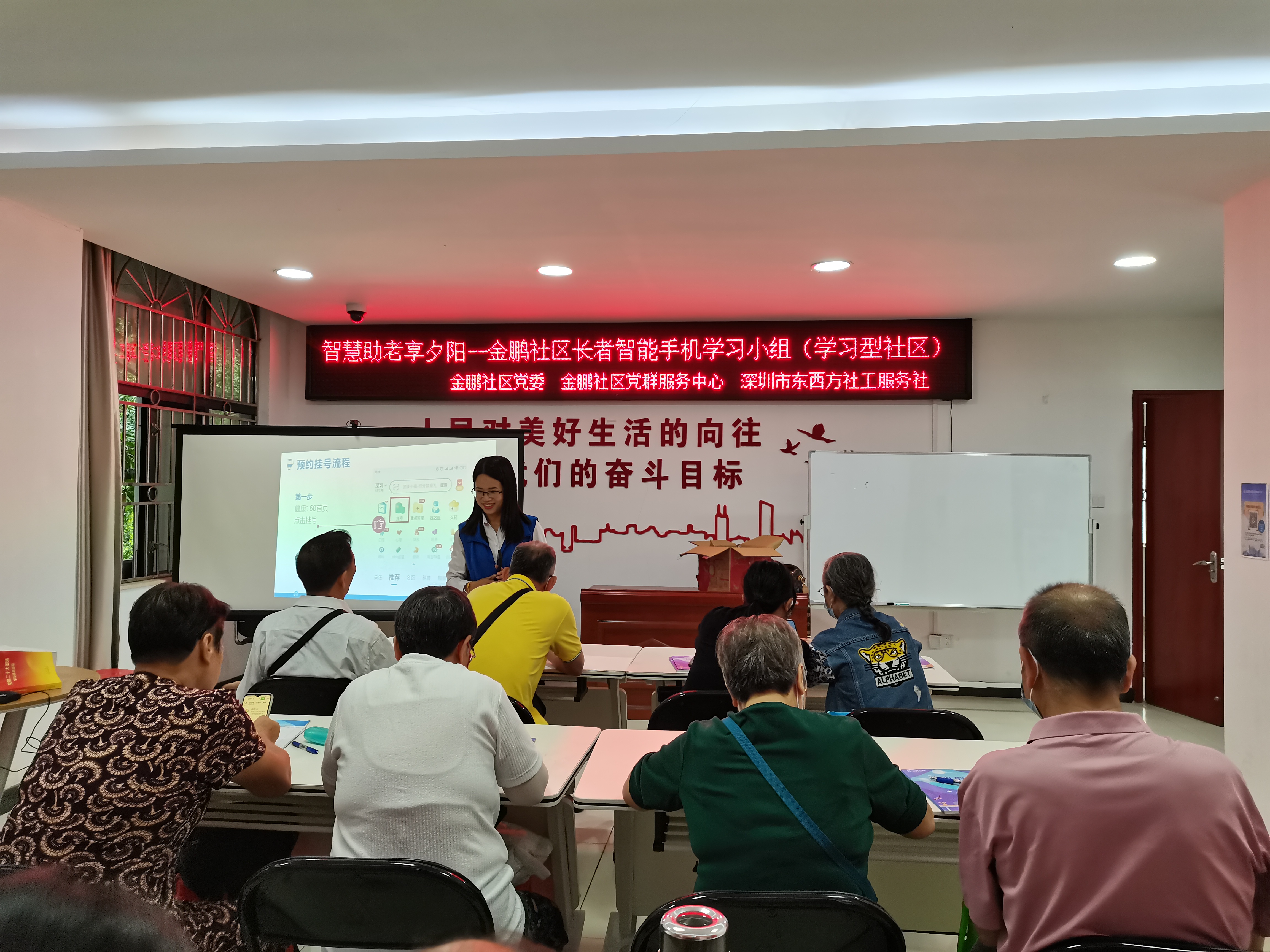 为了增强社区长者的生活便利性,帮助社区长者建立健康快乐的生活方式,以及丰富老年人日常生活,在东湖街道金鹏社区党委支持下,金鹏社区党群服务中心开展“智慧助老享夕阳”-金鹏社区长者智能手机学习小组(学习型社区)。