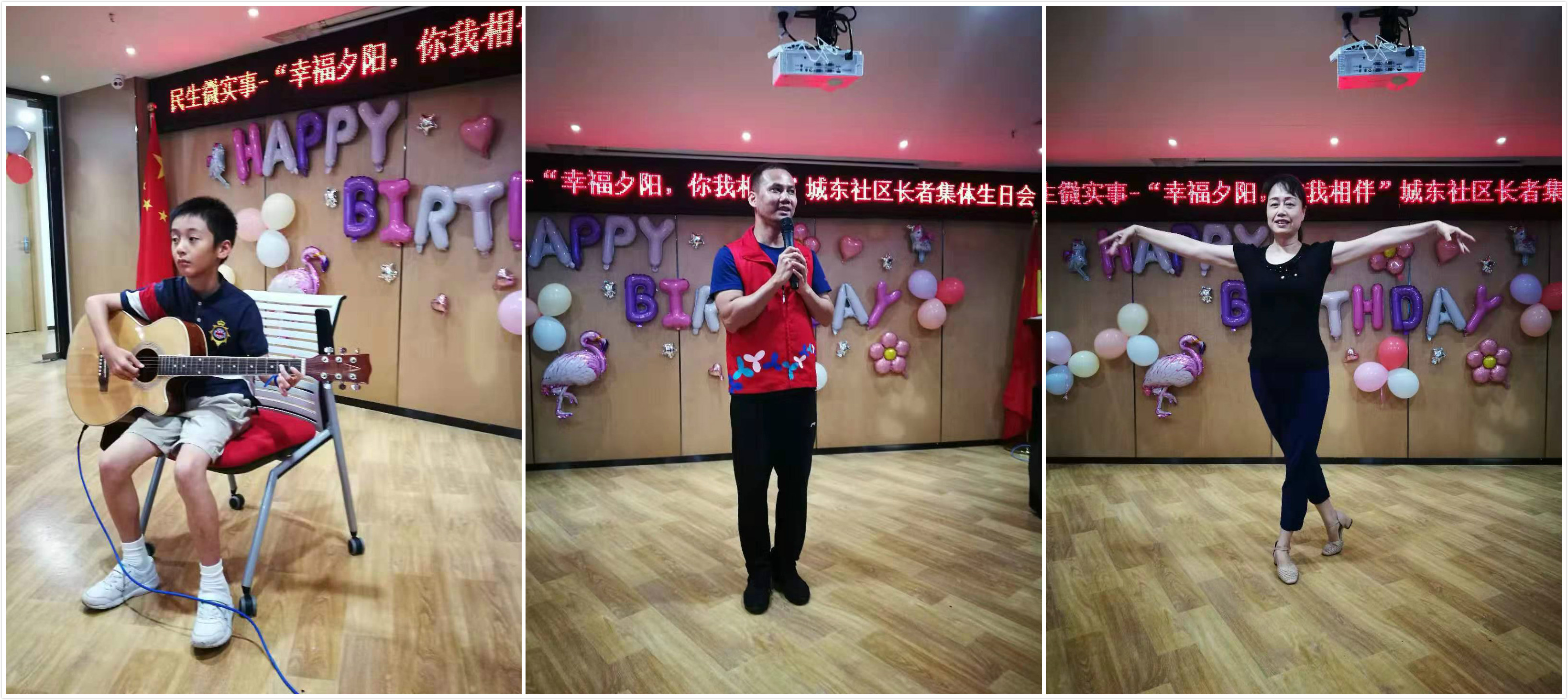 聪明可爱的方俊杰小朋友给爷爷奶奶们献上吉他演奏“献给爱丽丝”、“生日快乐歌”,优美稚嫩的音乐让大家仿佛回到了童年。演奏结束还不忘给爷爷奶奶们送上生日祝福:祝爷爷奶奶们生日快乐!身体健康!长命百岁!把在场的爷爷奶奶们逗得开心得合不拢嘴。林社工也为寿星们带来了歌曲“天下第一情”,嘹亮的歌声使人振奋,现场掌声不断。随后在温社工的带领下,寿星叔叔阿姨们玩起了“击鼓传花”游戏,音乐响起后突然停下,几轮下来,5位叔叔阿姨非常幸运地被邀请作自我介绍或者才艺表演。吴阿姨的舞蹈,许叔叔歌声使现场气氛欢快而热烈,他们的表演展现了城东社区长者多才多艺的风采。在游戏中叔叔阿姨们加深了彼此的了解,开心地交流着。陈阿姨开心地对社工说:“感谢你们啊,社区开展这么好的活动,让我们久没见的邻居今天又见到了,真的是又开心又激动,非常感谢你们,希望以后能更多的开展这样的活动!”