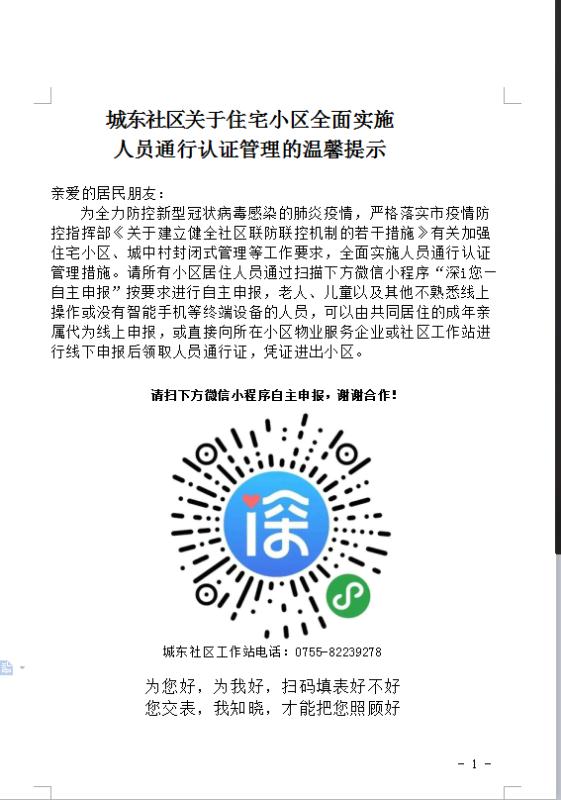 城东社区关于住宅小区全面实施人员通行认证管理的温馨提示