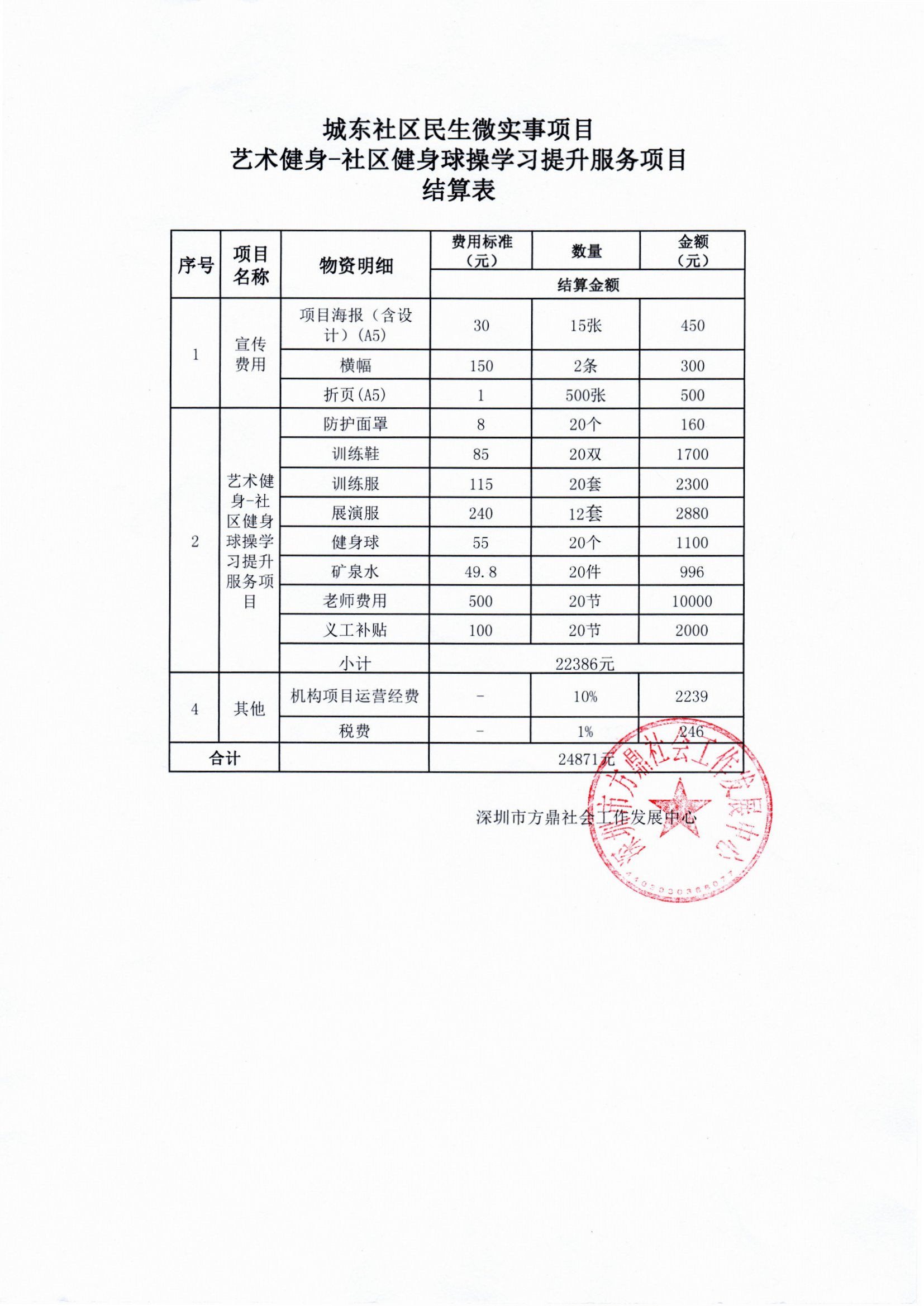 艺术健身-社区健身球操学习提升服务项目结算表