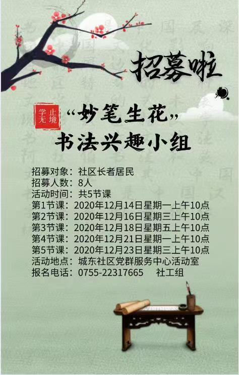 【招募】城东社区党群服务中心将开展“妙笔生花”书法兴趣小组