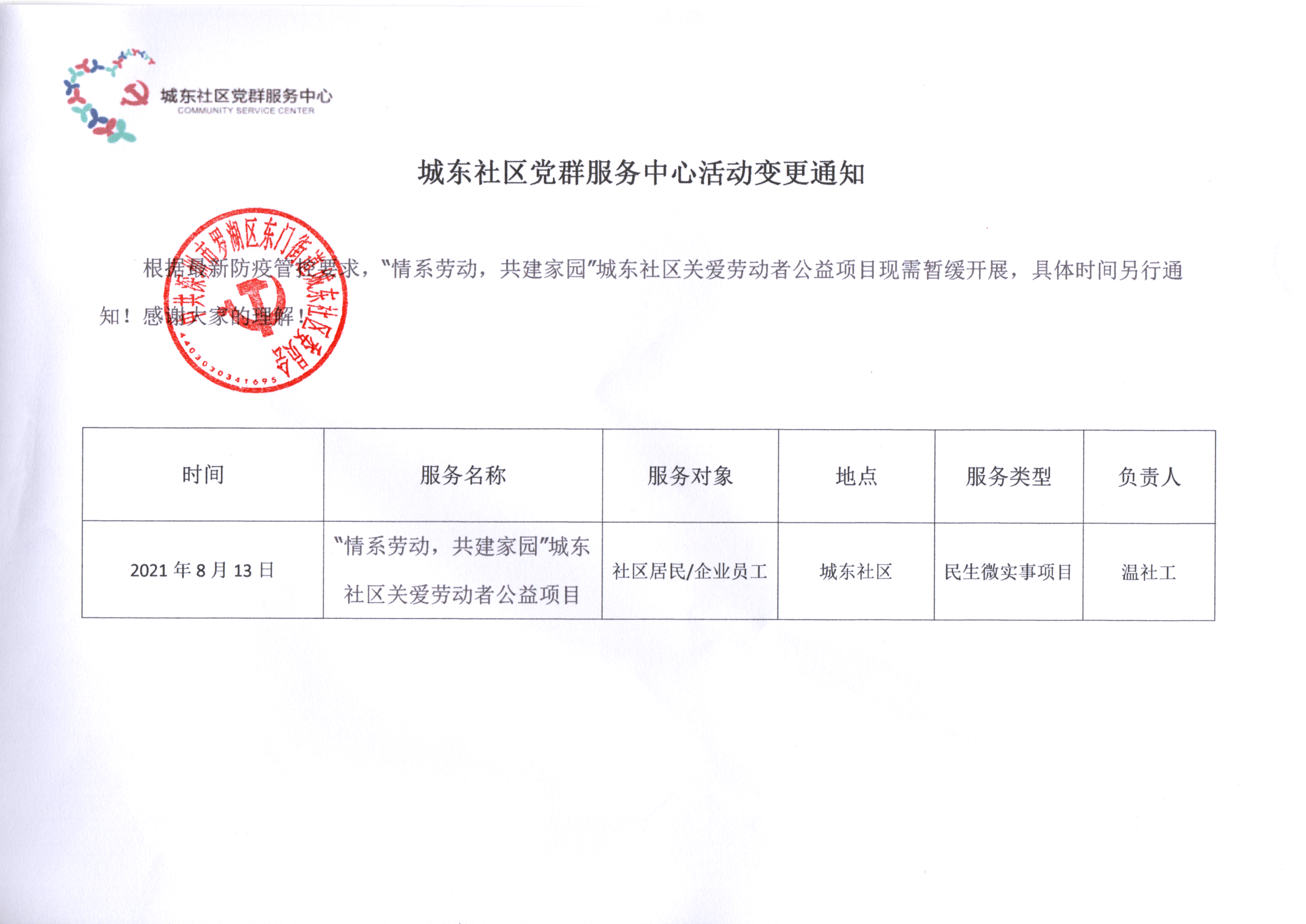 根据最新防疫管控要求,“情系劳动,共建家园”城东社区关爱劳动者公益项目现需暂缓开展,具体时间另行通知!感谢大家的理解!