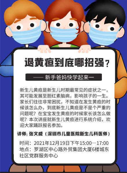 内容:新生儿黄疸是新生儿时期最常见的症状之一,其可能发展至胆红素脑病,影响孩子的一生。家长们往往非常困扰,不知道在发生黄疸的时候该怎么办,到底新生儿黄疸是不是个严重的问题呢?在宝宝发生黄疸的时候家长该怎么做呢?本次讲座就新生儿黄疸进行系统介绍,欢迎大家踊跃报名参加。