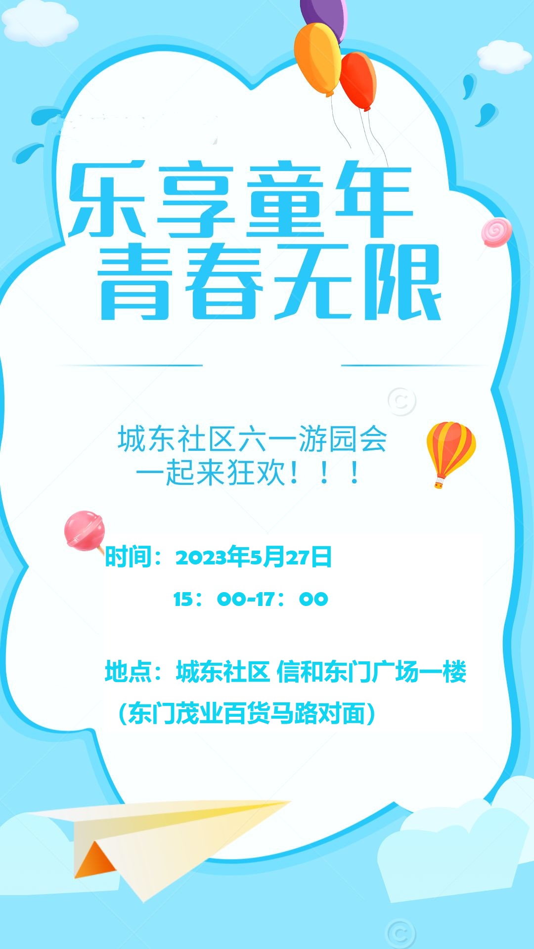 为庆祝六一国际儿童节,放松身心,感受社区魅力,丰富社区青少年的精神文化生活,5月27日,城东社区新时代文明实践站将开展“乐享童年,青春无限”城东社区六一游园会。有精彩的表演、好玩的摊位游戏和丰富的奖品等你来,欢迎大家一起欢度六一!