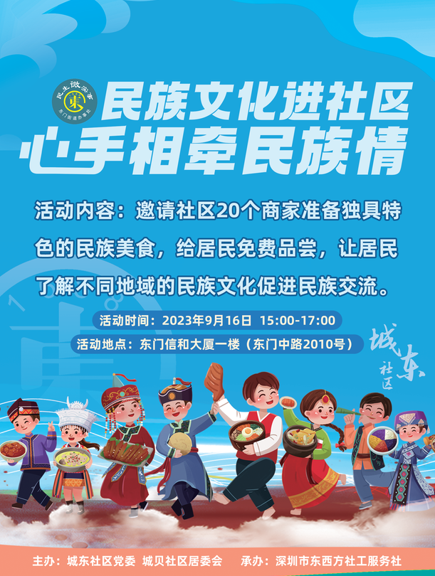 活动内容:邀请社区20个商家准备独具特色的民族美食,给居民免费品尝,让居民了解不同地域的民族文化,促进民族交流。