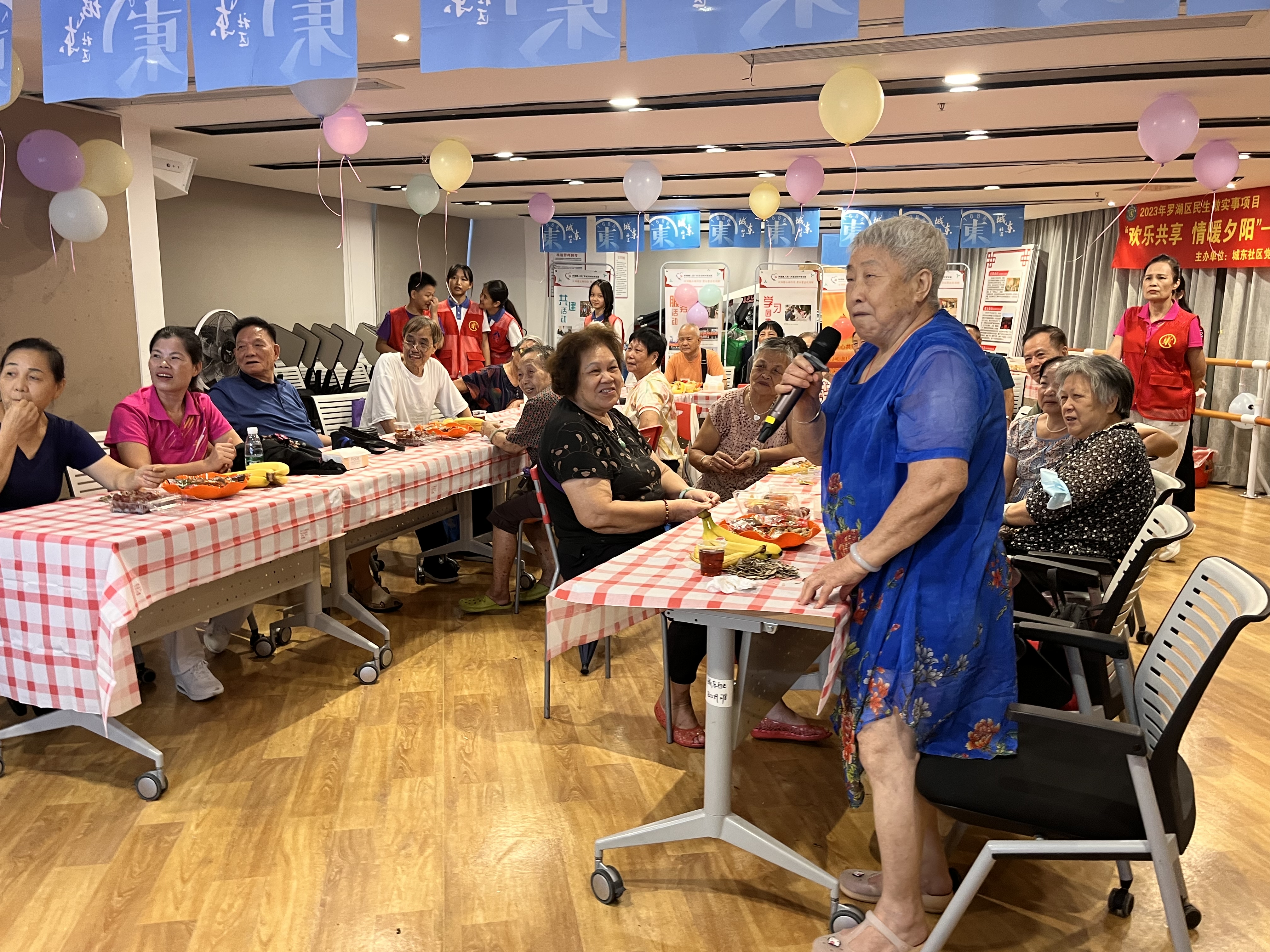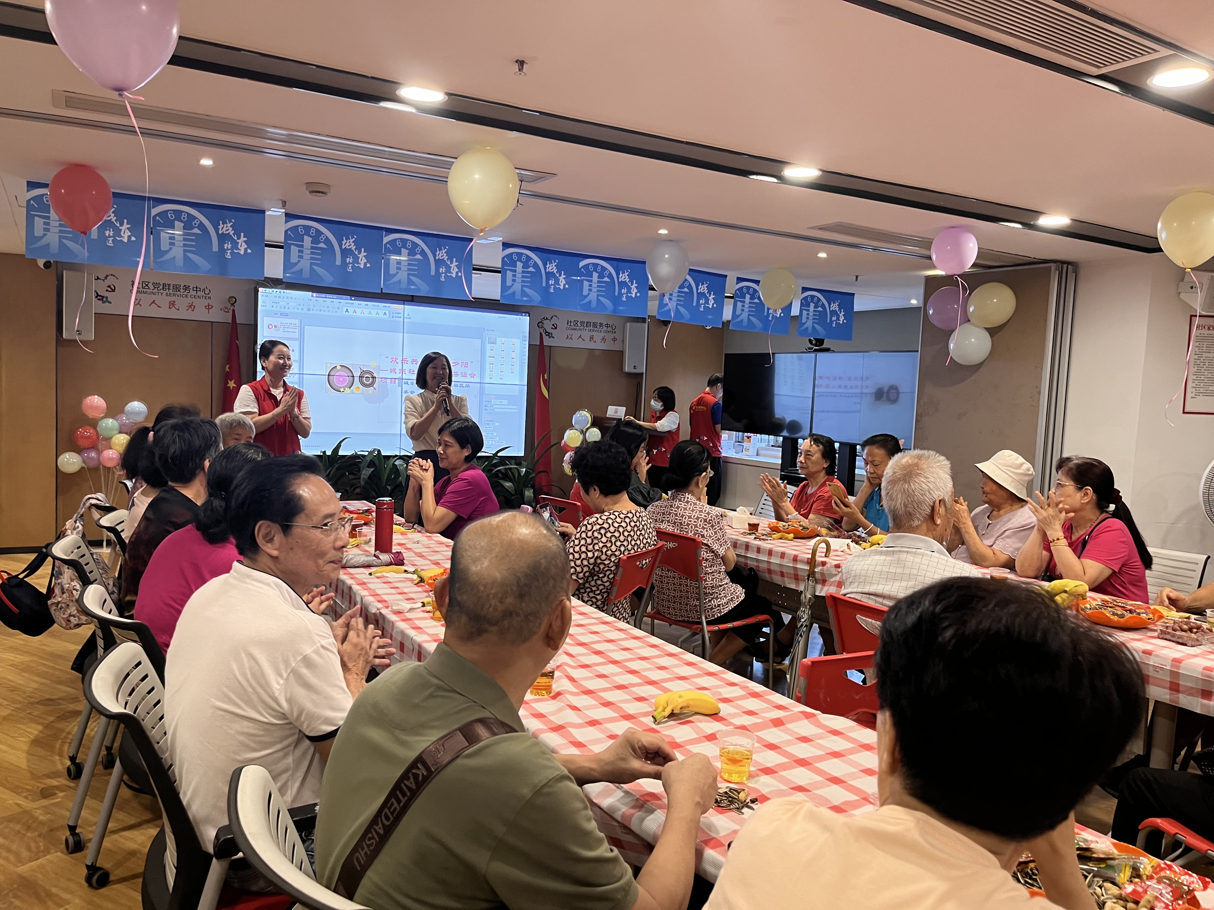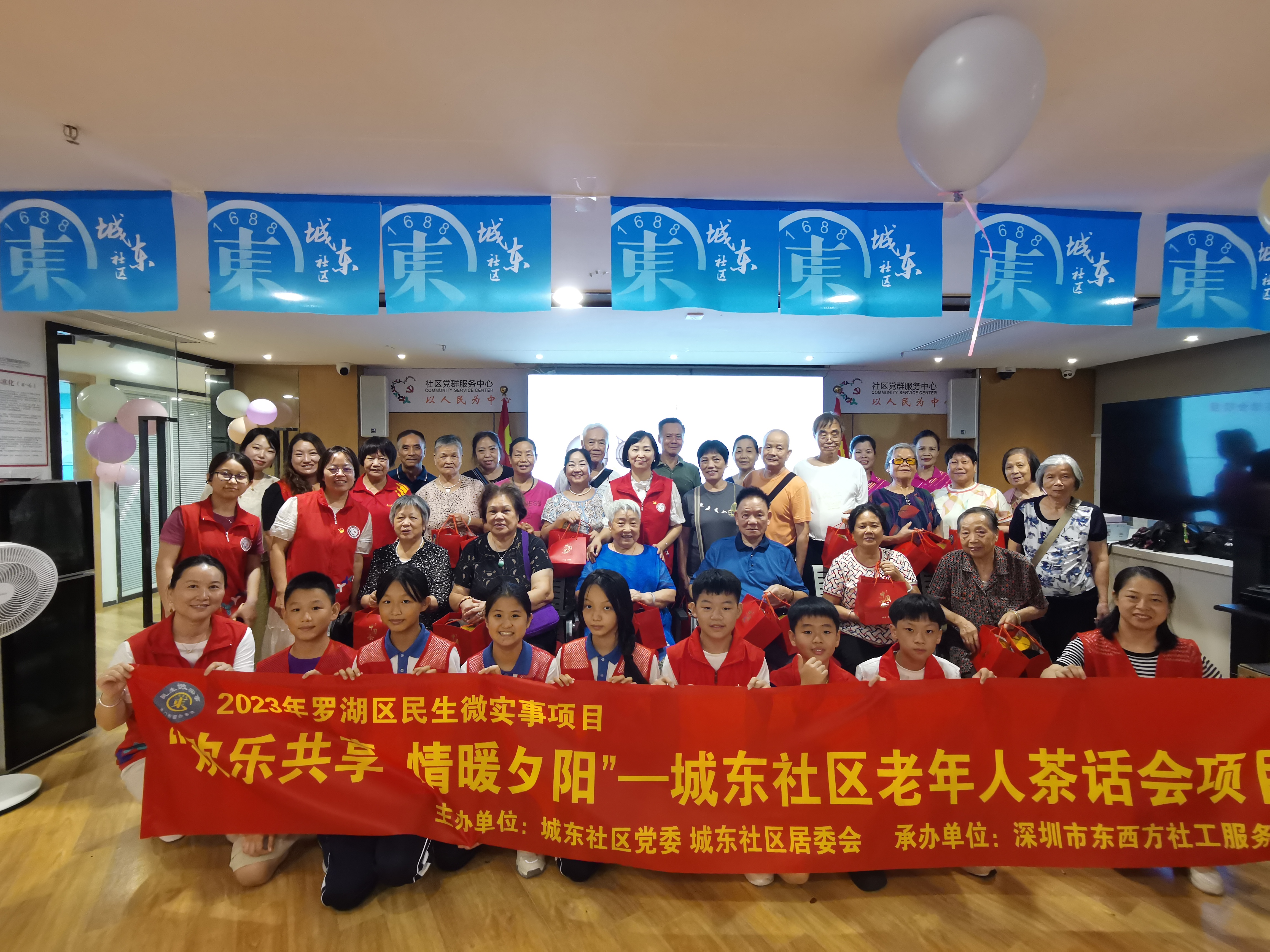 罗湖家园网讯:近日,由罗湖区民生微实事项目资金支持,由城东社区党委、城东社区居委会主办,由深圳市东西方社工服务社承办的“情暖夕阳、欢乐共享”城东社区老年人茶话会项目在城东社区党群服务中心开展,共吸引了60多名社区老年朋友参加。由于人数偏多,本次活动分为两场举行,8月28日、8月29日各举行一场。活动开始前,城东社区社工和志愿者们对会场进行了精心的布置,现场被装点得温馨漂亮。