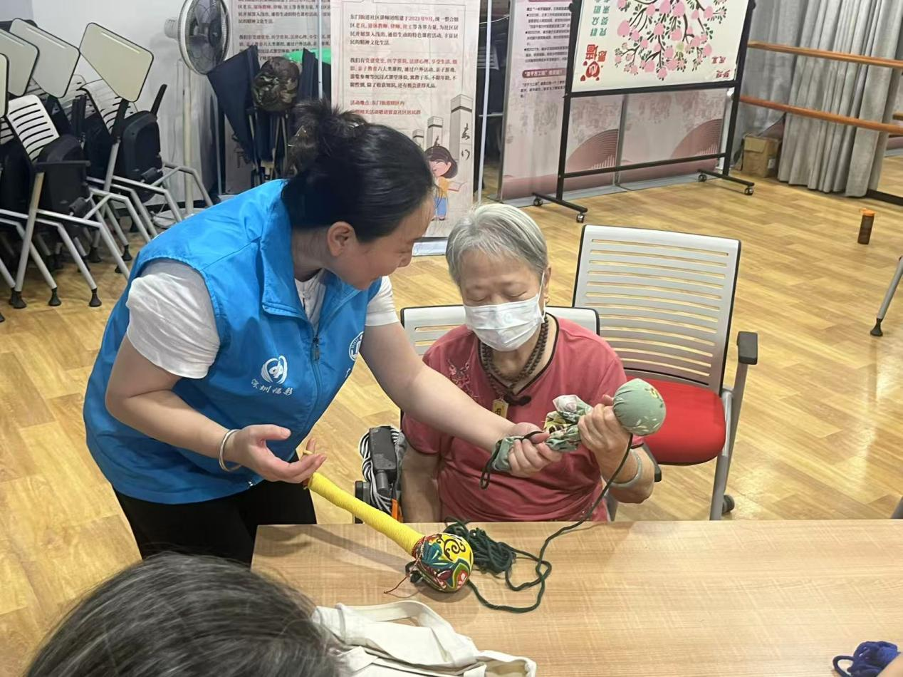 讲解结束后,社工现场演示了艾草锤制作的全过程。从干艾草的整理、棉布的裁剪,到艾草的填充、棉线的缝合,再到最后的结饰点缀,每一个步骤都讲解得细致入微,生怕老人们看不清楚。老人们看得兴致勃勃,跃跃欲试。随后,大家便迫不及待地投入到亲手制作艾草锤的环节中。他们在工作人员的耐心指导下,根据自己的喜好和中医老师的建议,认真地整理艾草、填充棉布、缝合边缘,忙得不亦乐乎。不少老人还结合自身的身体状况调整艾草的填充量,在创作中感受着独特的乐趣,活动室内充满了专注与欢乐的气息。