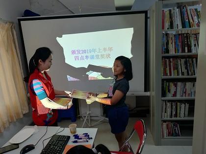 四点半课堂结业典礼在“开火车喊代号”热身游戏中拉开了帷幕。热身游戏结束,社工为四点半课堂的小朋友们设置暑假安全知识有奖问答环节并在典礼的最后为学员们颁发2019年上半年“四点半课堂”奖状同时给予每个孩子们学期寄语以资鼓励,希望学员能继续保持。