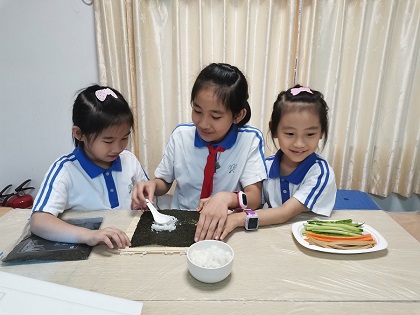 活动前,社工为小朋友们准备了制作寿司的竹帘及各类寿司食材,如海苔、米饭、火腿肠、胡萝卜丝、黄瓜丝等。活动开始后,社工利用PPT图文并茂地为组员讲解了寿司的历史文化、操作步骤及注意事项等。讲解之后,小朋友们开始团队合作制作寿司,不一会儿,孩子们都做出了外形美观又美味可口的寿司。“老师,这是我的第一次制作寿司,好好吃,我要拿回家给爸爸妈妈尝尝”。吃着自己动手制作的寿司,每位小朋友脸上都洋溢着自豪。
