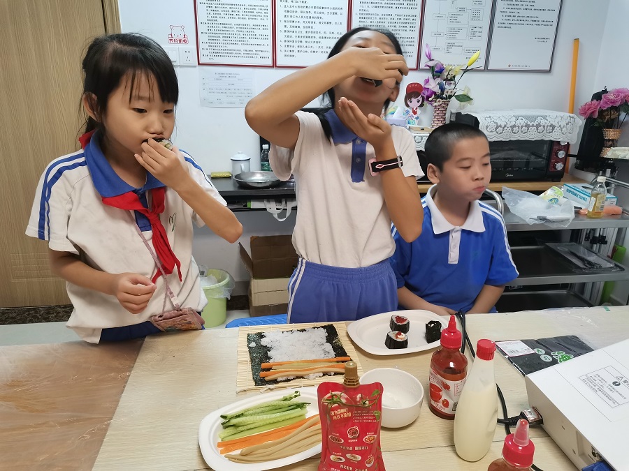 此次工作坊共设置了3种美食制作,分别是“美味寿司”、“水果果冻、“甜甜糯米糍”。刚开始学习时,小朋友们都感觉到不知所措,经过一次次的共同努力,每个小朋友们都制作出精致而可口的美食。制作完成后,组员们迫不及待的进行品尝,纷纷为自己点赞,还将美食打包留给家人。