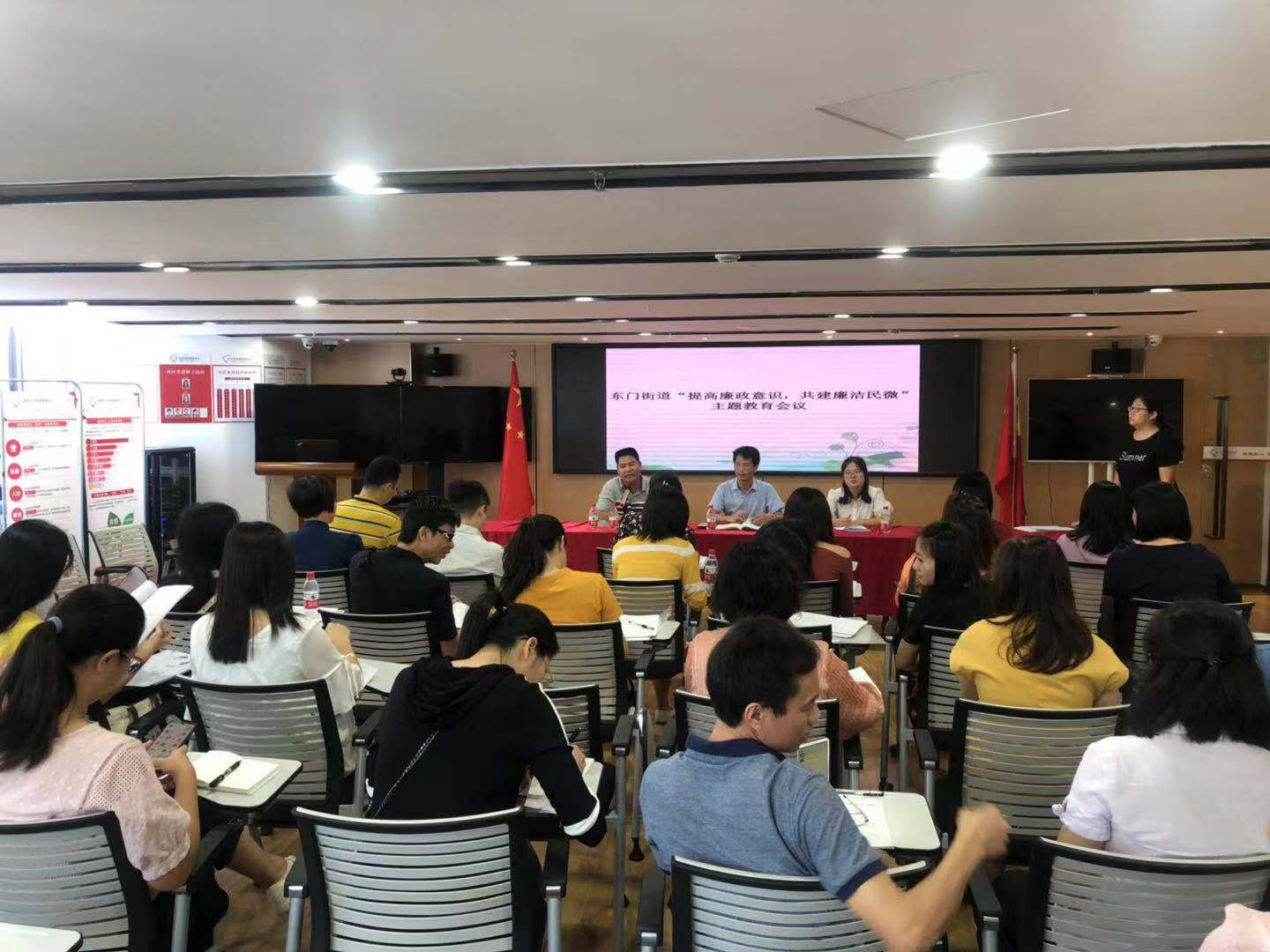 罗湖社区家园网讯:2019年10月17日星期四上午9:30,湖贝社区党委书记、副书记,及民微工作人员参加东门街道“提高廉政意识,共建廉洁民微”主题教育会议。