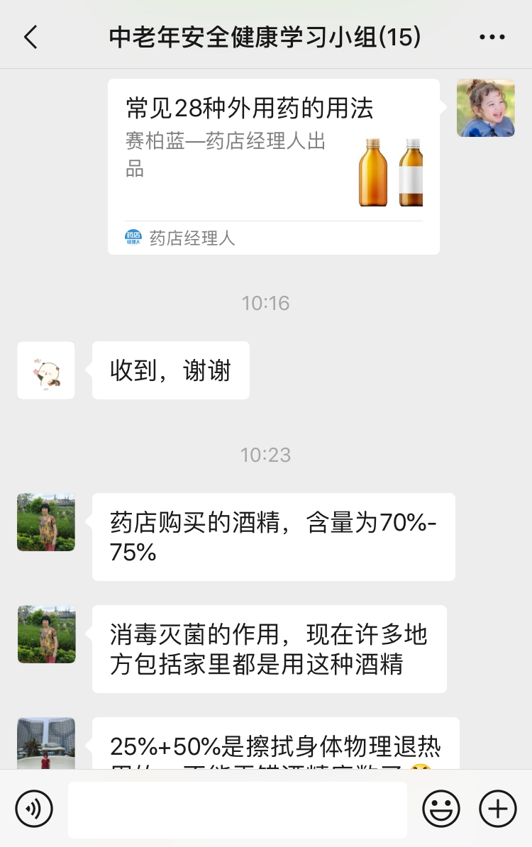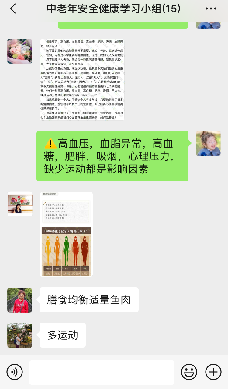 六节小组以居家安全、出行安全、食药安全的内容为主题,围绕中老年居民常见的、易发生的安全危机进行知识普及学习。组员们在小组中相互监督学习,以信息、图文、视频等不同方式增加中老年居民们对出行、居家、饮食等方面的安全防范意识。