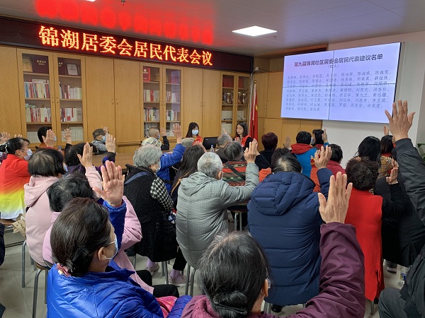 会上,首先由工作人员宣读“锦湖社区居民委员会第九届居民代表建议名单”。接着对第九届居民代表建议名单行举手表决,通过举手表决,最后推选出新一届居民代表52名。