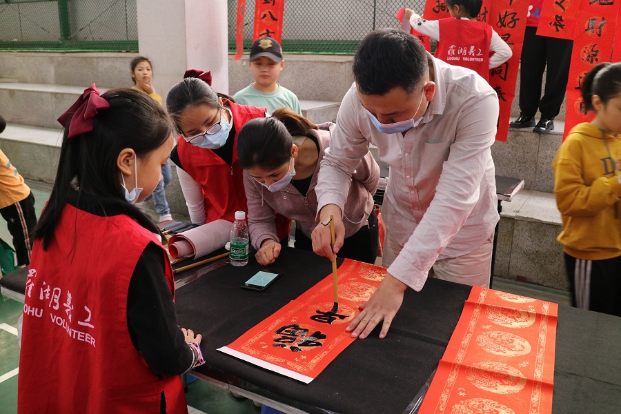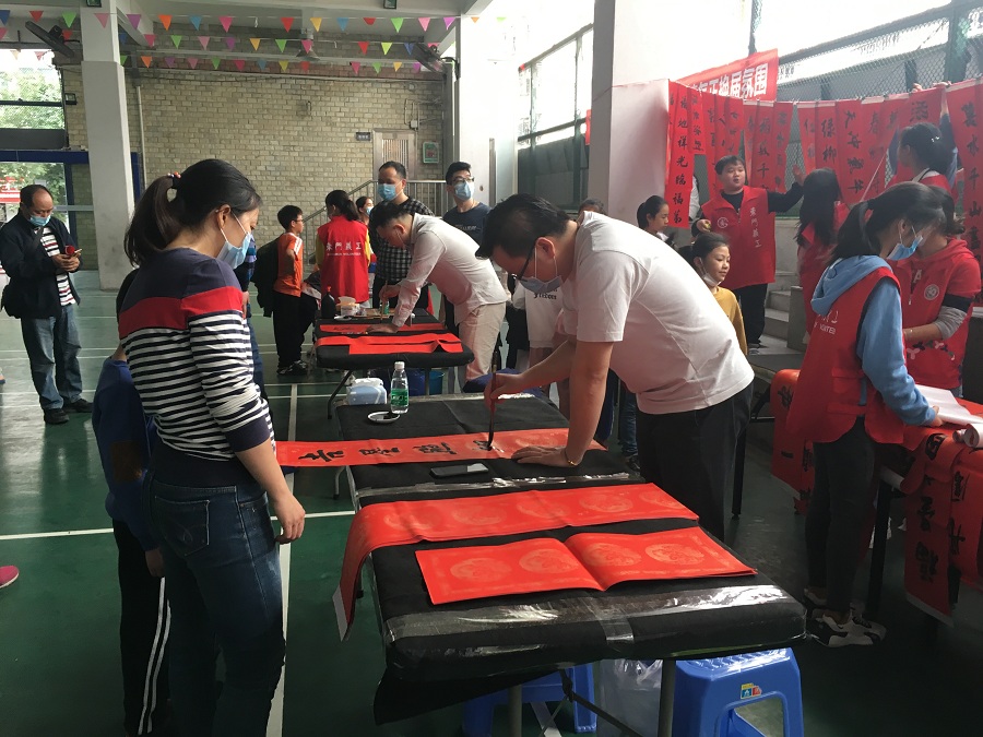活动现场一片红火喜气,书法老师们挥毫泼墨,一行行的字苍劲有力,吸引得居民们不住的赞美感叹。现场还有小小志愿者维持秩序,协助书法老师将写好的春联一字排开,为居民整理书写好的春联。