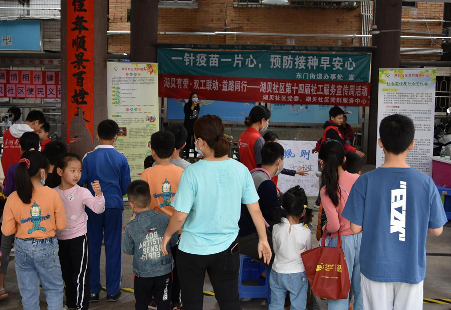 以深圳市第十四届“社工宣传周”为契机,以弘扬雷锋精神为思想引领,结合志愿者服务宣传招募。湖贝社区党群服务中心在湖贝社区党委的支持下,于3月27日上午在社区广场开展了“湖贝有爱·双工联动·益路同行”社工宣传周游园活动。
