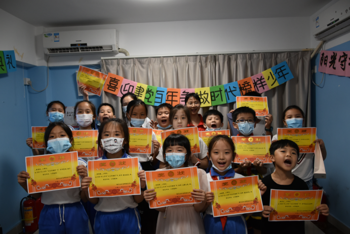 活动中,社工给小朋友们讲述了烈士小英雄“小萝卜头”的故事,和小朋友们一起回顾了四点半课堂的美好点滴,为每个学员小朋友颁发了奖状和精美奖品。小朋友们被“小萝卜头”在恶劣的条件下,仍克服困难坚持热爱学习的精神所感动,纷纷表示暑假期间也要克服疫情困难,努力学习,并主动向小英雄致敬。