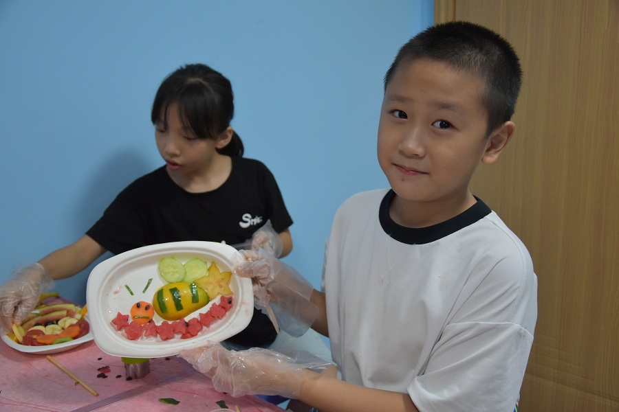 各节活动除了让组员观看水果相关知识的视频和讨论分享,组员们还组队分别制作了美味的火龙果香蕉奶昔、水果沙拉,每个组员都发挥自己的创意,制作了富有创意和特色的水果拼盘,并跟其他小朋友介绍自己的作品,共同分享美食。