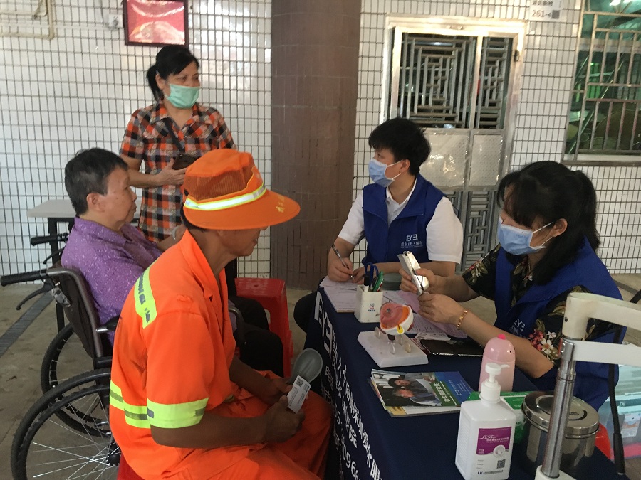 在疫情防控时期,活动开展期间志愿者协助社工进行现场的人流控制及温馨提示。爱尔眼科医院的眼科医生通过检测设备为参与居民进行不同程度的眼部检测,根据参与居民现场检测的结果,以一对一的咨询管理方式向居民提供有针对性的治疗及预防建议。同时,协助医师及志愿者向周边居民派发眼部疾病预防宣传册,让居民能更加清晰的了解眼部疾病及预防知识。