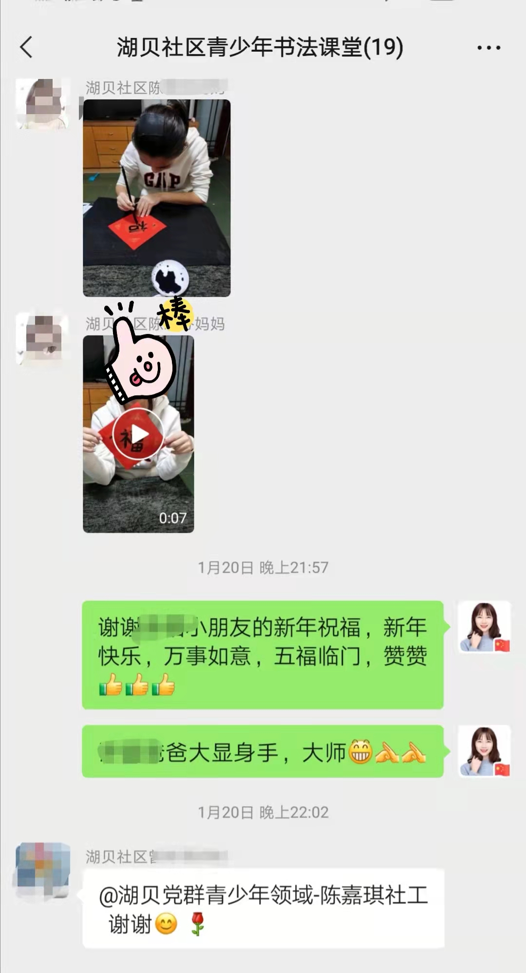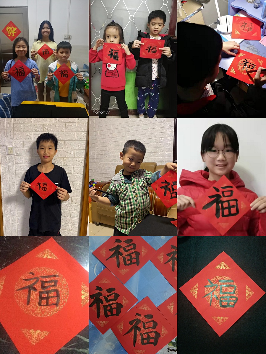 近日,在湖贝社区党委的大力支持下,湖贝社区新时代文明实践站、湖贝社区党群服务中心开展了“传承文化,书写文明”青少年书法课堂最后一节活动。因为处于疫情时期,此节活动采取预约领取书法用品、微信群和线上视频互动的方式进行。参与本次活动的社区青少年们在家里书写“福”联作品,并和家长合作录制视频祝福语,以此表达自己对新年的期盼,也向身边的亲朋好友传递美好的祝福和愿望。