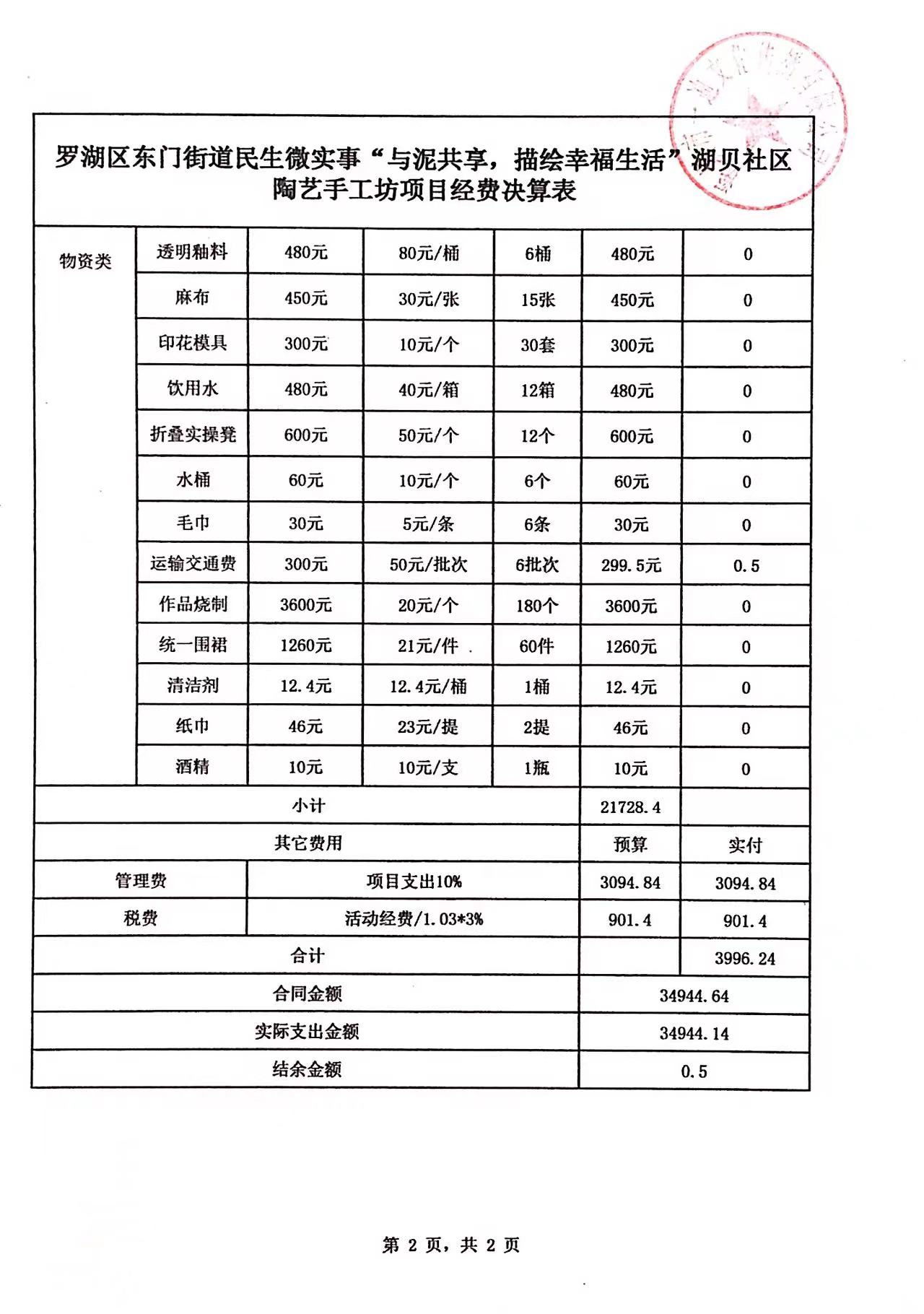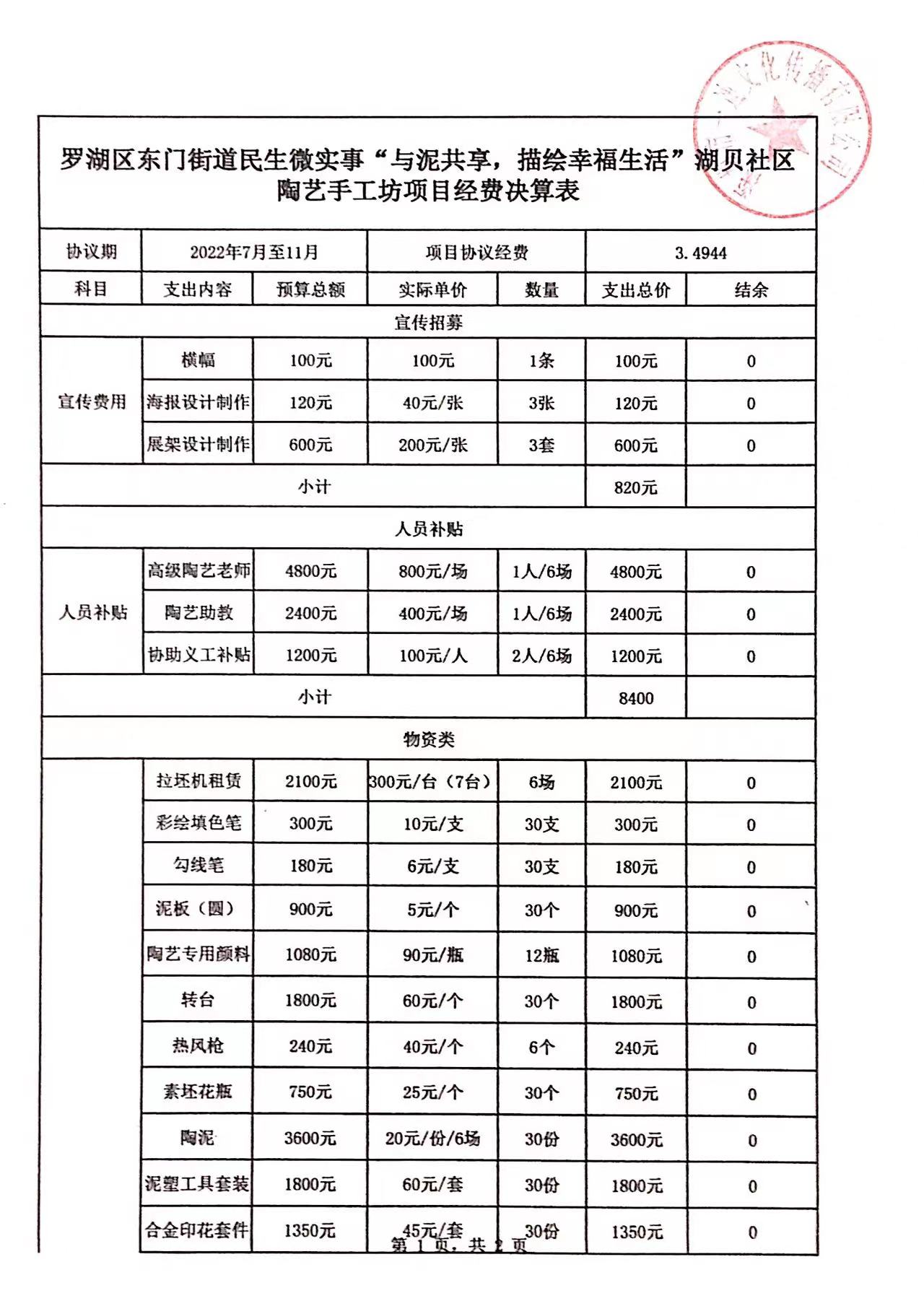 “与泥共享·描绘幸福生活”湖贝社区陶艺手工坊项目经费决算表