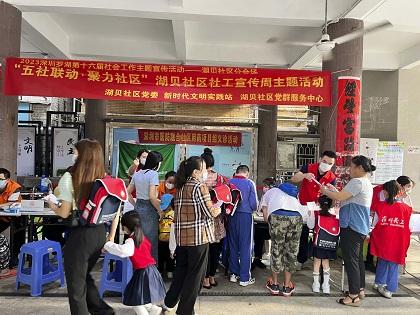 2023年3月23日,以湖贝社区为平台、社会工作者为支撑、社区社会组织为载体、社区志愿者为辅助、社区公益慈善资源为补充,开展“2023深圳罗湖第十六届社会工作主题宣传活动——湖贝社区分会场”。