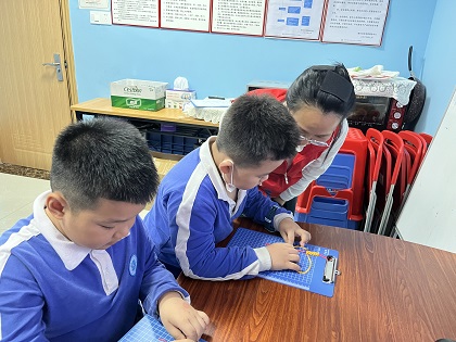 左边绳子在上,右边绳子从底下穿过去,慢慢调整,然后拉紧两边绳子,一个漂亮的平结就这样编织出来了…小朋友一边听社工讲解,一边细心地观察编织的规律,在一次一次试错中耐心调整,小朋友们锲而不舍的精神,社工连连点赞。在总结分享环节,小朋友一起回顾非遗工作坊四节活动的点点滴滴,有个小朋友分享说:“制作竹编船比较难,但我最后还是克服困难顺利完成了”,有个小朋友说参加非遗工作坊她学习了很多传统文化,这个活动很有意义。