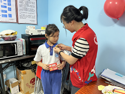 活动现场,社工带领学员共同回忆四点半课堂的点点滴滴,学员从中感受到自己的好行为对外界的积极影响,朋辈关系也更加紧密了,有学员说道:“在四点半课堂我交到了很多朋友。”“我在这里参加了非遗活动,还和妈妈一起参加了亲子美食活动,我很开心”“四点半课堂有很多有趣的漫画书,我下次还要来”…小朋友你一言我一语,好不热闹。接着,社工将亲自给每一位学员手写的祝福贺卡,赠送给他们,还为学员颁发了激励胸章,激励他们成为“想成为的人”,温暖自己也照亮他人。随后,小朋友们学习了“防溺水安全知识”,将暑期安全牢记于心。