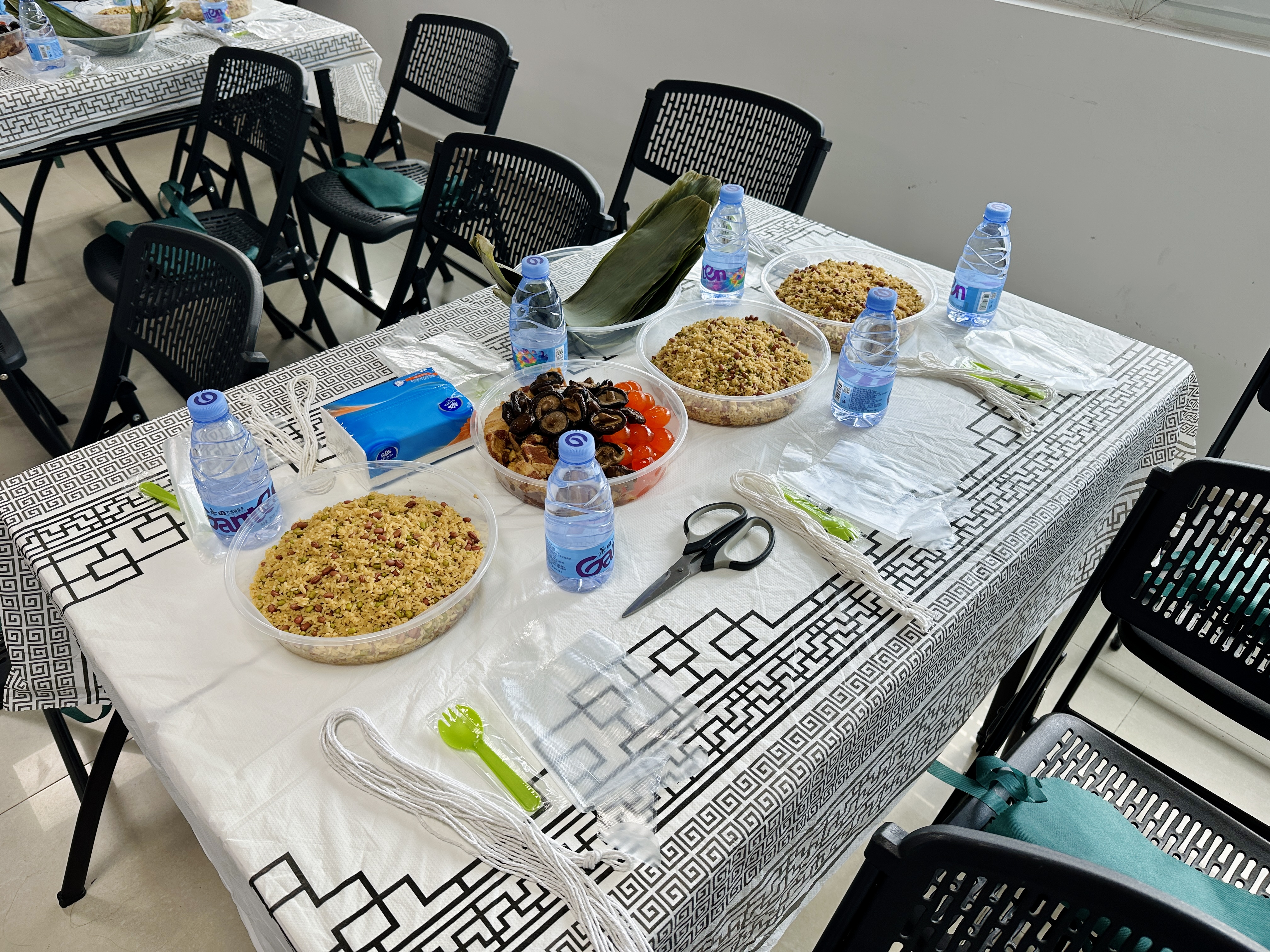 清晨阳光明媚,今天的天气格外地晴朗,一大早工作人员精心准备了所有活动需要的材料,在桌上整齐地摆放着粽叶、糯米、猪肉等,以及布置了彩旗气球,充满着节日的氛围,等候的居民的到来。