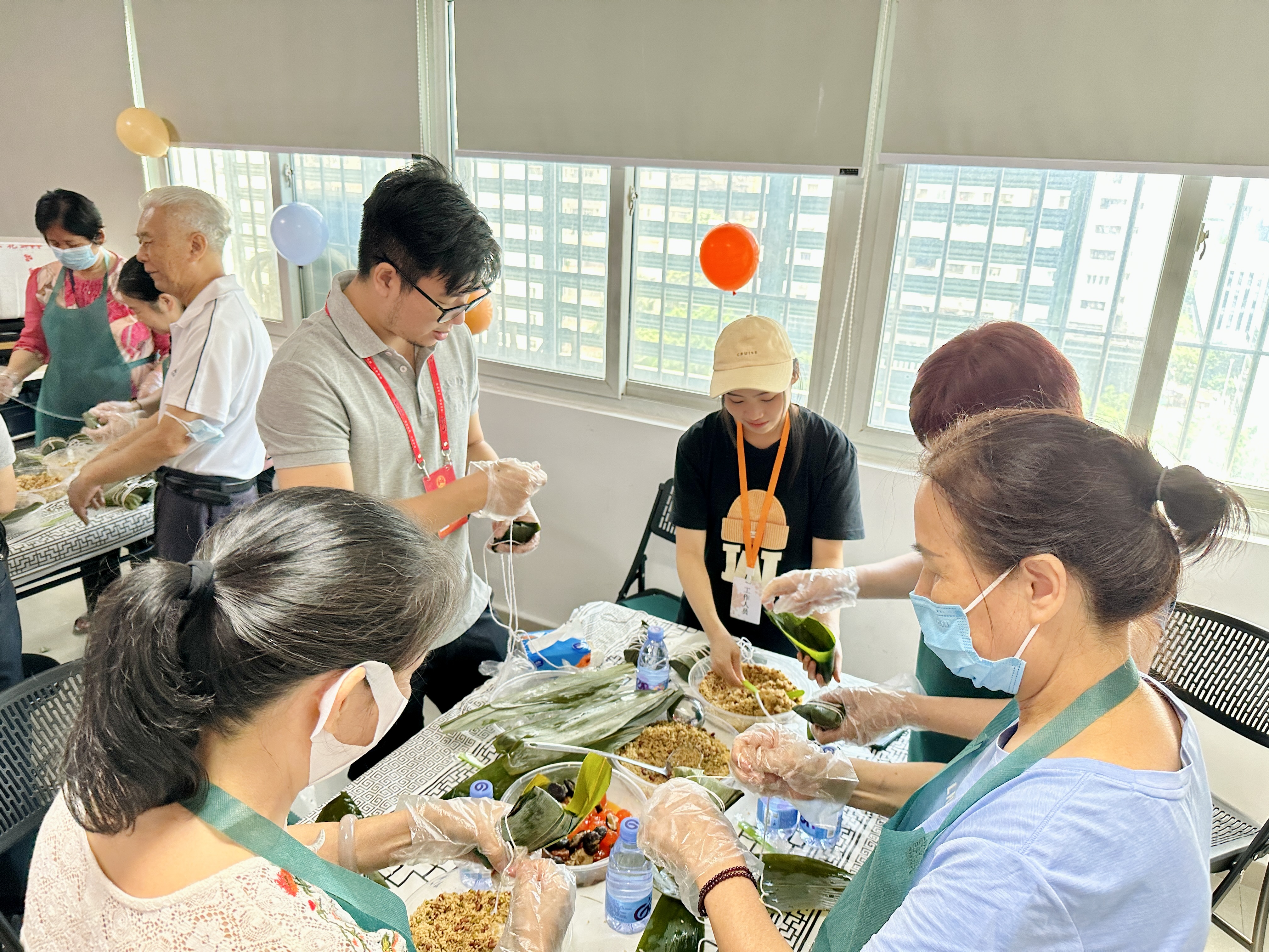 活动开始后,首先由工作人员跟居民们互动,进行小游戏热身“击鼓传花”,当音乐停止时,花在谁手上,幸运儿就要进行节目表演或节日送祝福,小游戏传递着每位长者的幸福笑容,大家玩得不亦乐乎。随后由专业烘焙老师进行粽子教学,老师给大家生动讲解了端午的背景来由,和六种粽子的包法,有三角粽、四角粽、宝塔粽、长粽等,同时还向大家展示了包粽子的步骤,居民们也开始紧跟老师的节奏开始动手,大家巧手翻飞、技法娴熟,转眼间,一个个棱角分明的粽子呈现在大家面前,相互开始分享包粽子的心得。
