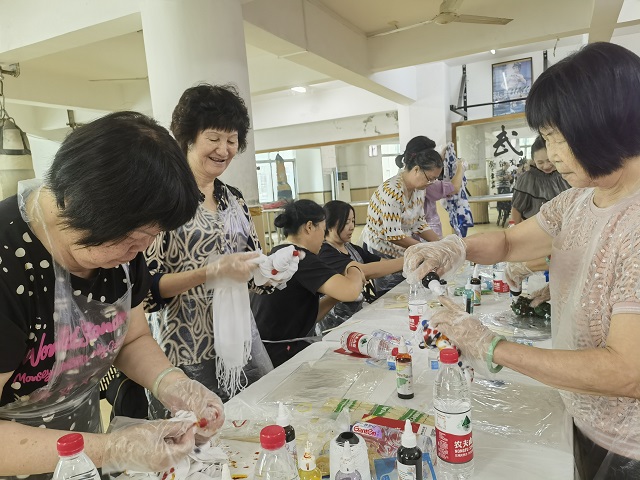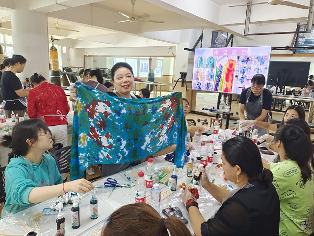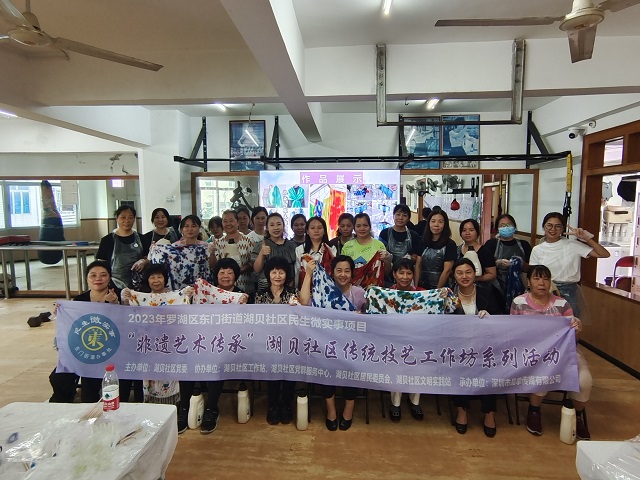 扎染既是千年传承的作品,也是一件杰出的艺术品,是蕴含着作者艺术思想和心态的珍品,它充满人性色彩,是人民勤劳、质朴、纯洁、诚实、善良和乐观、开朗、热情好客等美好品格和情趣化的象征,更是人们心中特殊的文化象征和民族传统艺术的标徽。湖贝社区通过扎染手工制作,让居民发挥自己的想象力和创造力,创造出独特的扎染作品,展现个人的审美情趣和艺术风格,深入了解和体验传统文化的精髓和美学价值,从而更好地传承和弘扬传统文化。