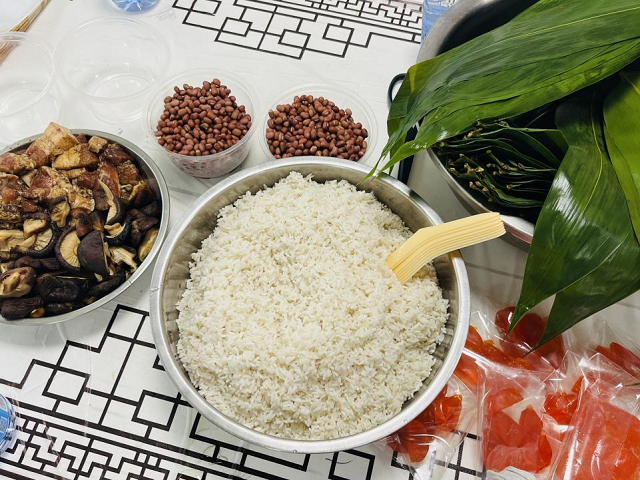 活动当天,社区活动室内热闹非凡,飘逸的彩旗和可爱的气球营造着浓浓的节日气息。现场提前准备好了五花肉、糯米、红豆、香菇、咸鸭蛋等丰富多样的粽子馅料,以及新鲜的粽叶和绳子,整齐地摆放在桌上,仿佛在召唤着大家开启一场美味的创作之旅。