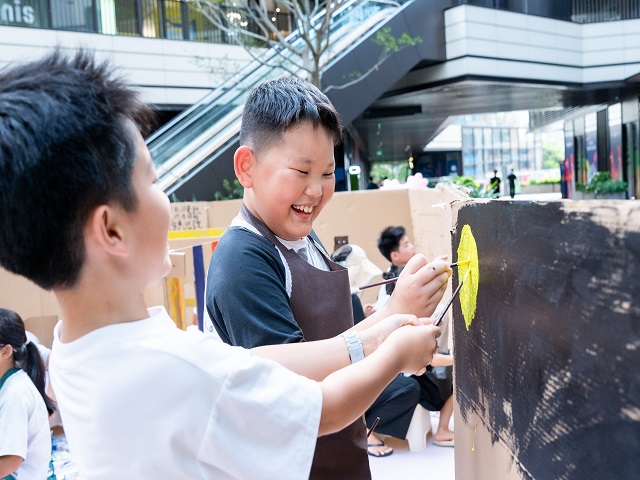 活动现场,最受孩子们欢迎的莫过于“儿童mini折叠社区空间绘画体验”。在支起的纸箱城堡前,小朋友们化身“社区设计师”,用彩笔勾勒出自己心中的理想家园:有的画下飘着花香的折叠小路,有的描绘了和伙伴嬉戏的广场,还有的定格了关爱社区流浪猫的温馨瞬间。