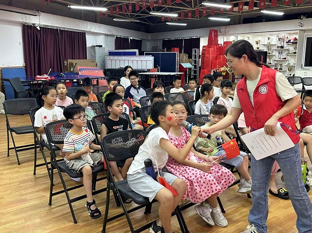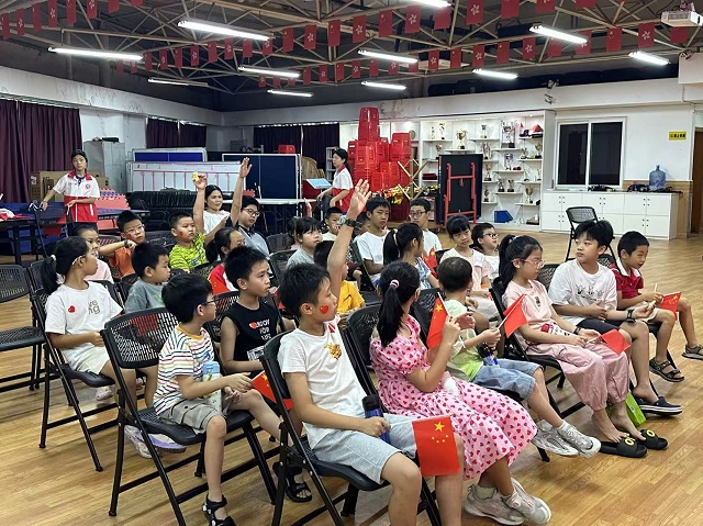 接着是“国庆知识小课堂”暖场环节。社工通过趣味问答的形式,向孩子们介绍了国庆节的由来、意义以及相关历史知识。“大家知道我们为什么要过国庆节吗?”“国旗上的五颗星分别代表什么?” 社工的问题刚抛出,孩子们踊跃举手,积极抢答,现场气氛热烈而欢快。这一寓教于乐的环节,不仅点燃了孩子们的热情,更在他们心中深植了国家与民族的概念,增强了他们的民族自豪感和历史责任感。