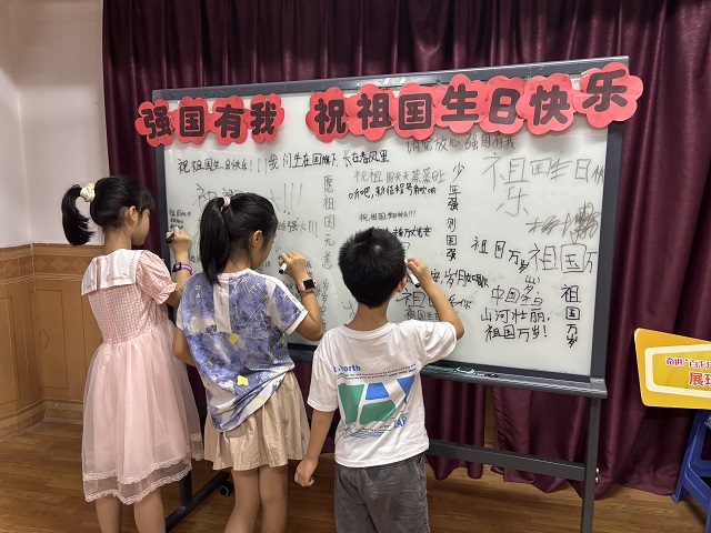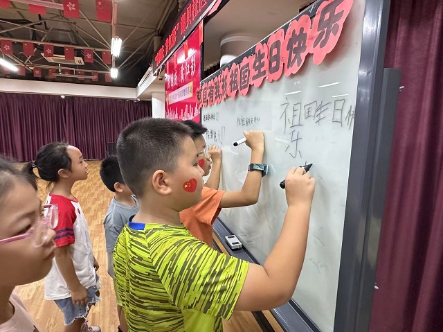 活动在洋溢着节日气氛的社区活动室拉开帷幕。首先映入眼帘的是一面精心布置的“国庆红色签到墙”,孩子们有序上前兴致勃勃地签下自己的名字,并郑重地写下对祖国母亲的深情祝福。“祝祖国妈妈生日快乐,繁荣昌盛!”“我爱你,中国!”“愿祖国越来越强大!”……一句句稚嫩而真挚的话语,汇聚成孩子们对祖国最纯粹的热爱与美好的祝愿,现场洋溢着浓浓的爱国情。