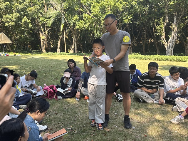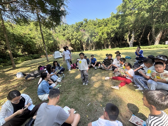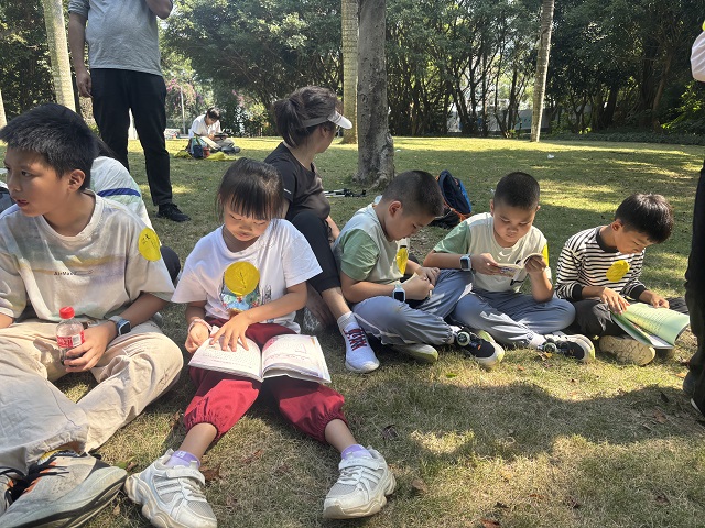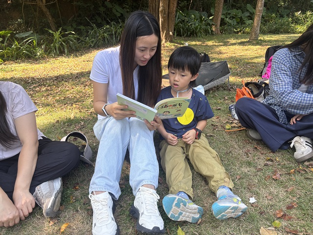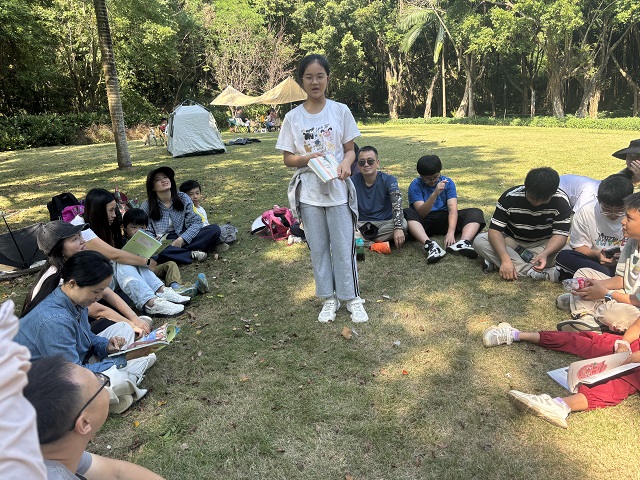 活动当天,大家沿着风景怡人的淘金山绿道徒步,在社工的引导下,选址一片开阔平坦的草坪,大家有序围坐在草坪上,孩子们迫不及待地互相展示自己带来的书籍,有的是科普读物,有的是经典绘本,还有的是童话合集。家长们放下手机,与孩子依偎在草坪上,共读孩子自带的专属读物。亲子间时而指着插图互动讨论情节发展,时而一起朗读精彩片段,沉浸式的阅读体验让亲子间的联结在自然氛围中愈发紧密。