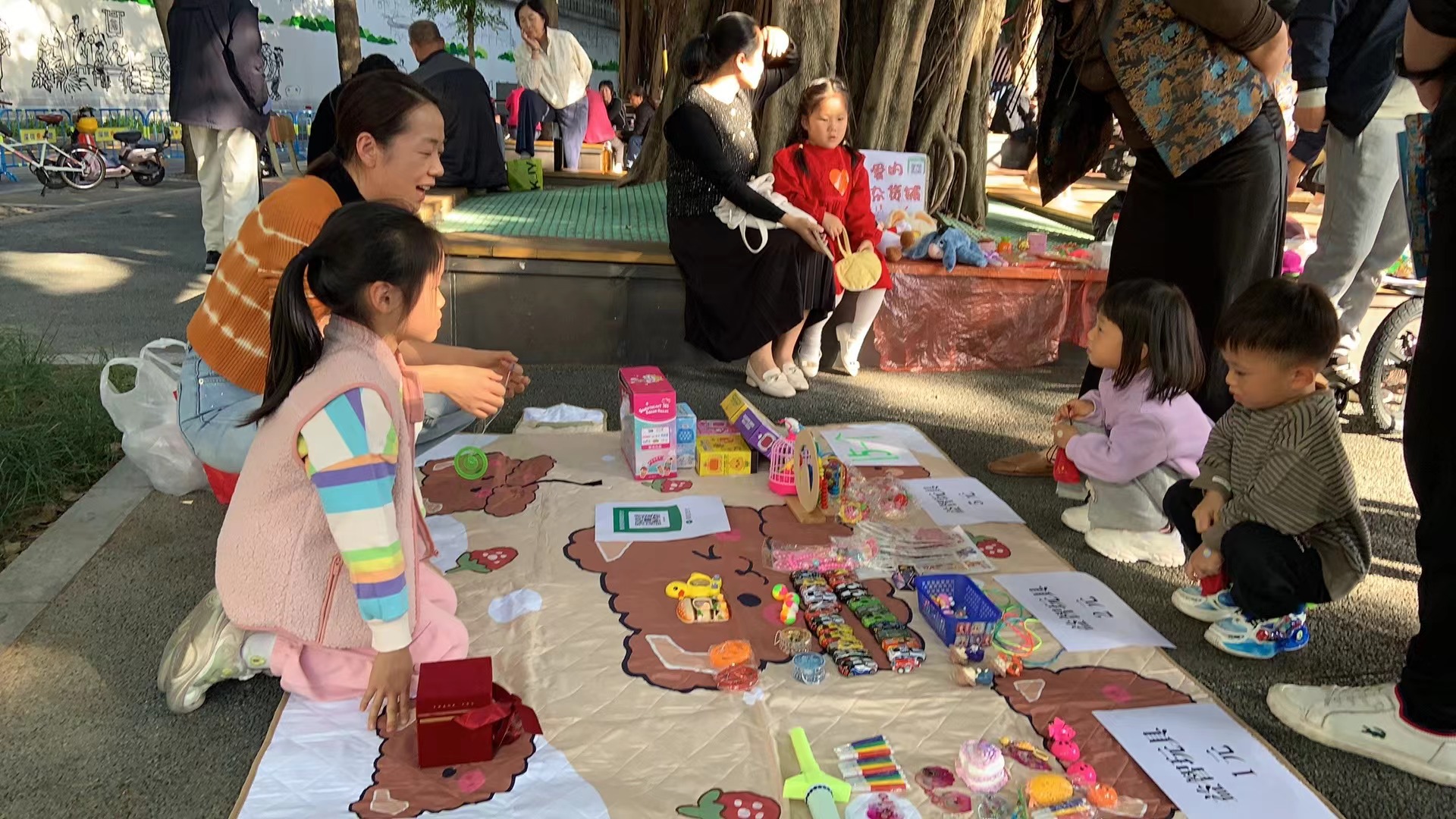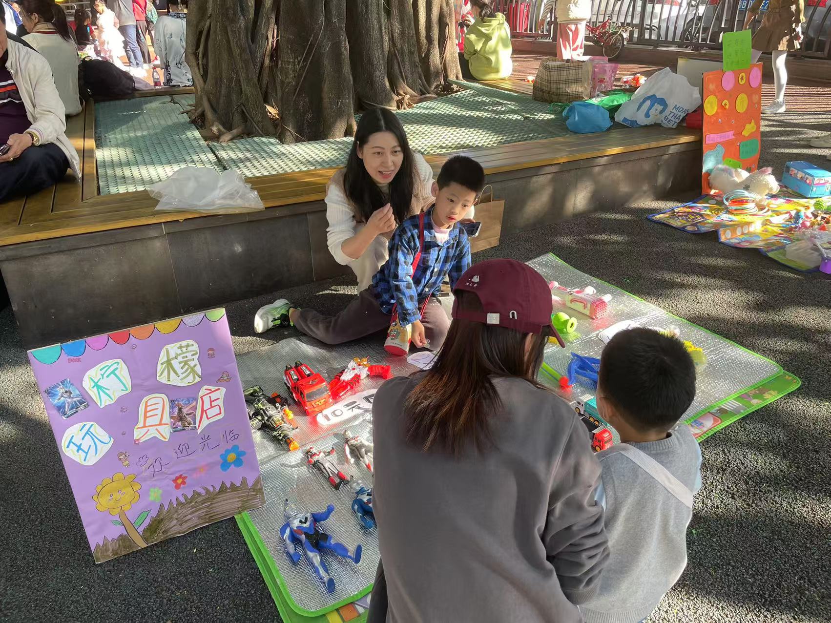 “走过,路过,千万不要错过,大家快来看一看、瞧一瞧……”活动现场传来阵阵响亮的吆喝声。玩具、文具、衣物、手工制品等都齐齐亮相,明码标价,一个个小摊位布置得富有个性和创意,一眼望去,只见宽敞的跳蚤市场挤满了各种店铺,商品琳琅满目,让人眼花缭乱。小摊主们和前来淘宝的居民朋友们讨价还价,一派生意兴隆的热闹景象。“小掌柜”们在售卖自己旧物的同时,也不忘到别人的摊位上逛一逛,置换、购买自己喜欢的宝贝,很多闲置物品在这里找到了新主人。活动现场呈现出浓浓的“烟火气”,交织出满满的“人情味”,大家都享受着售卖、置换和分享的快乐。