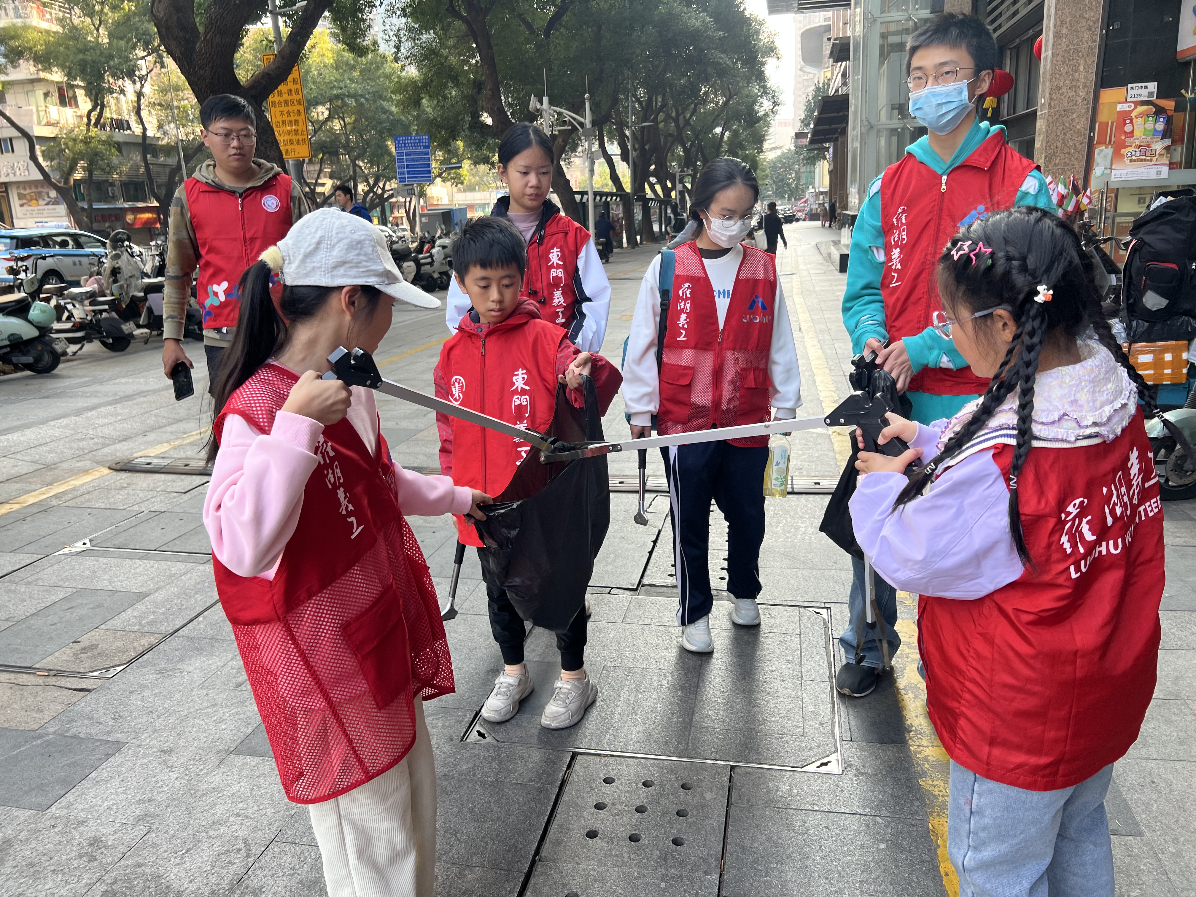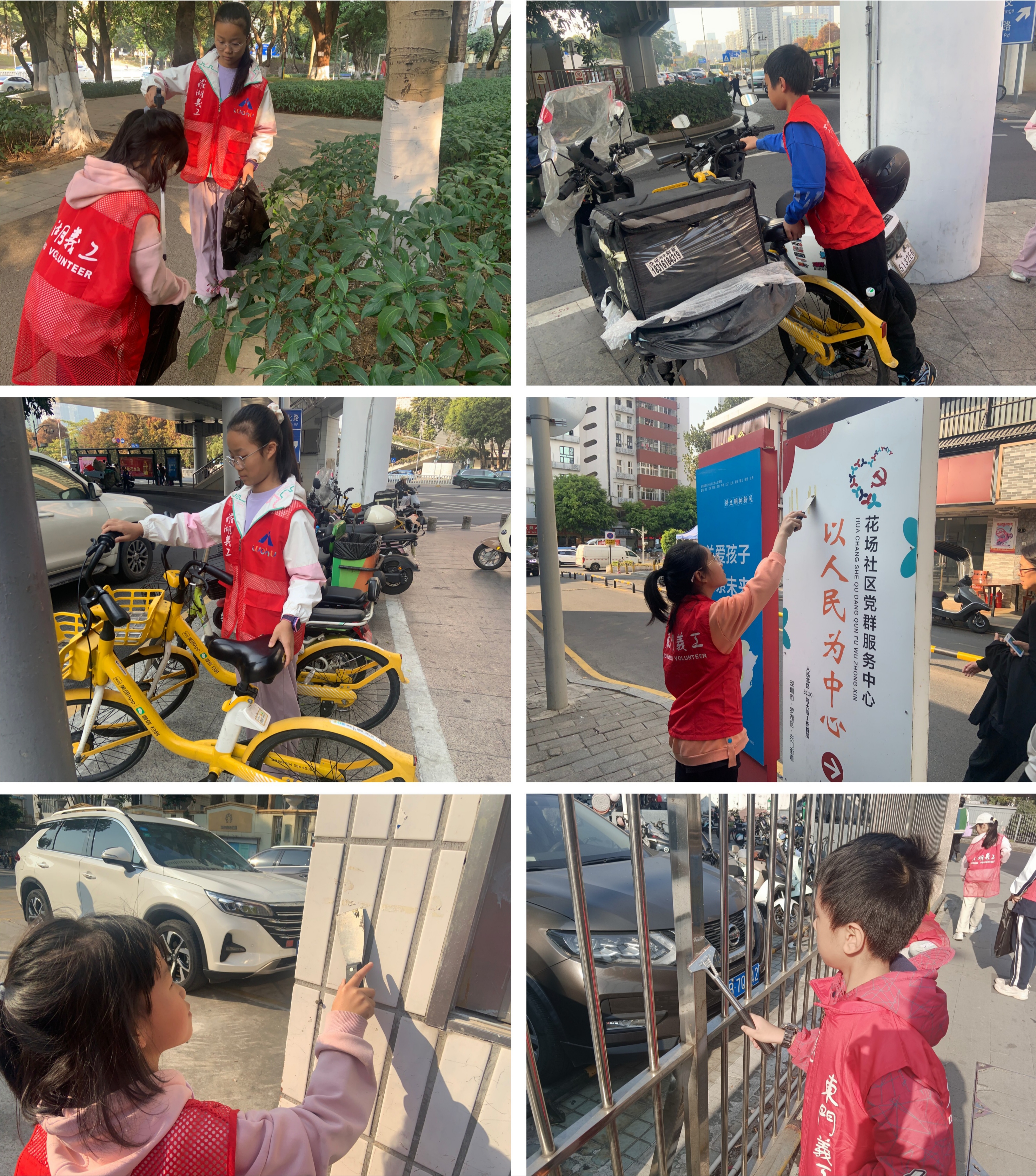 随后,大家身穿志愿者马甲,分成两个小组,并选出每组小组长。在社工带领下沿着社区道路清理路面垃圾、捡拾烟头、铲除小广告,把乱停放的单车、电动车移到停放处摆放整齐。冬日寒风中,青少年们发扬志愿者奉献精神,用眼睛去发现社区中不文明现象、用脚步践行志愿者精神、用双手去使社区家园更加美好。