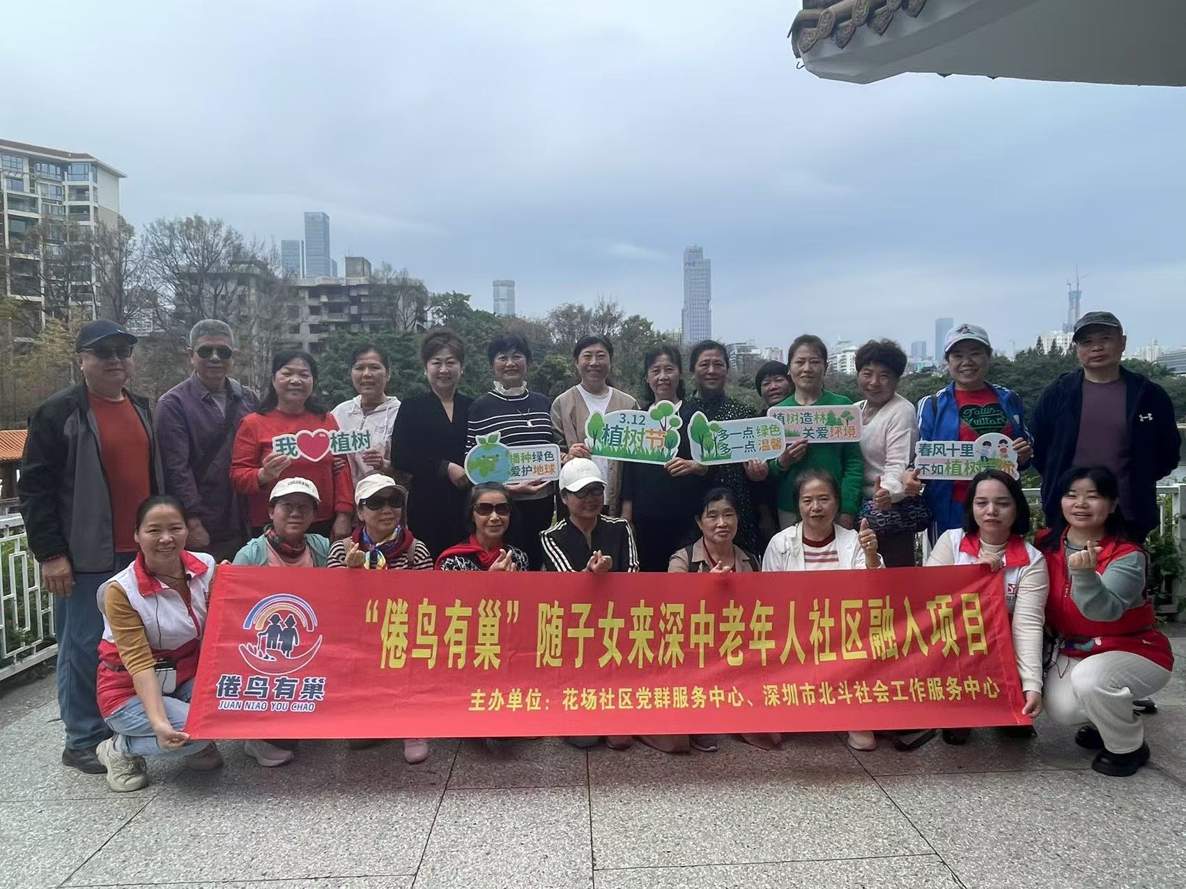 为贯彻落实"百千万工程",持续深化随迁老人社区融入服务,2025年3月12日,深圳市北斗社会工作服务中心开展了“倦鸟有巢”随子女来深中老年社区融合项目——“乐享银龄时光,拥抱城市美景”花场社区景点打卡活动,共计20名社区长者参与。