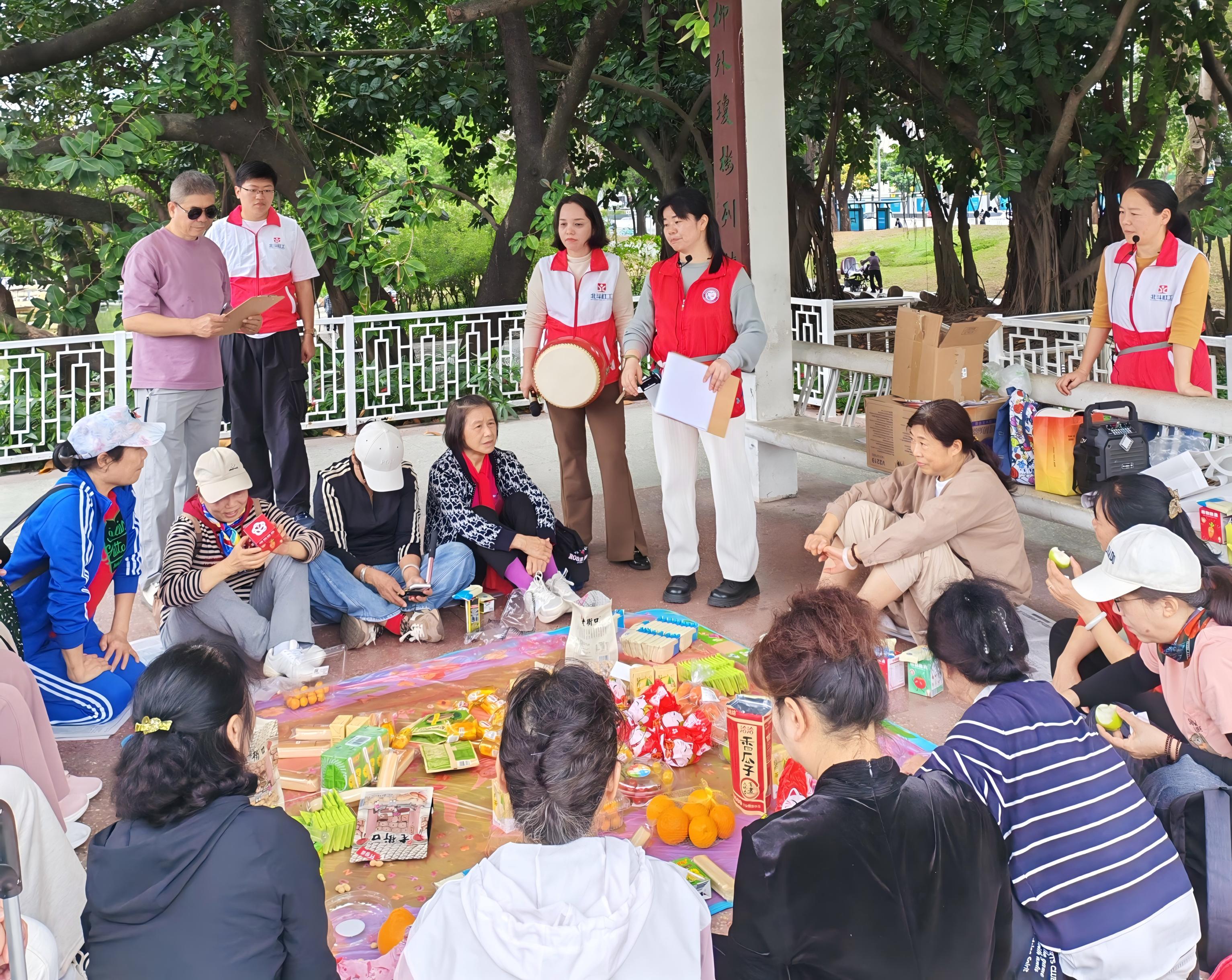 活动现场,社工首先带领长者们在荔枝公园开展破冰游戏。“姓名接龙”、“击鼓传花”以趣味接力的方式,让每位长者在欢声笑语中拉近彼此距离;“环保知识问答”,社工每提出一个问题,长者们便纷纷踊跃举手,争先发言,积极投身其中,展现出对环保知识的浓厚兴趣。社工引导居民深入思考日常生活中的环保行为。在一问一答之间,环保理念如春风化雨般浸润人心。长者们在轻松愉快的氛围中学习到了实用的环保知识,同时也增进了长者们之间的交流与互动。