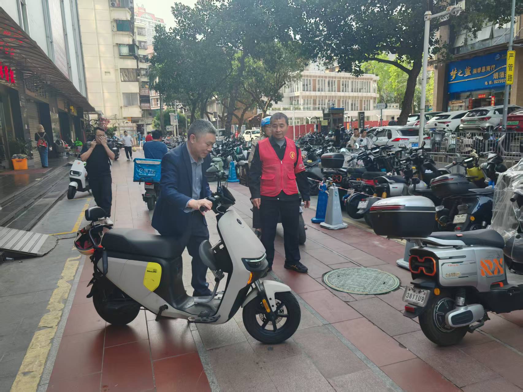 志愿者劝导居民佩戴带头盔