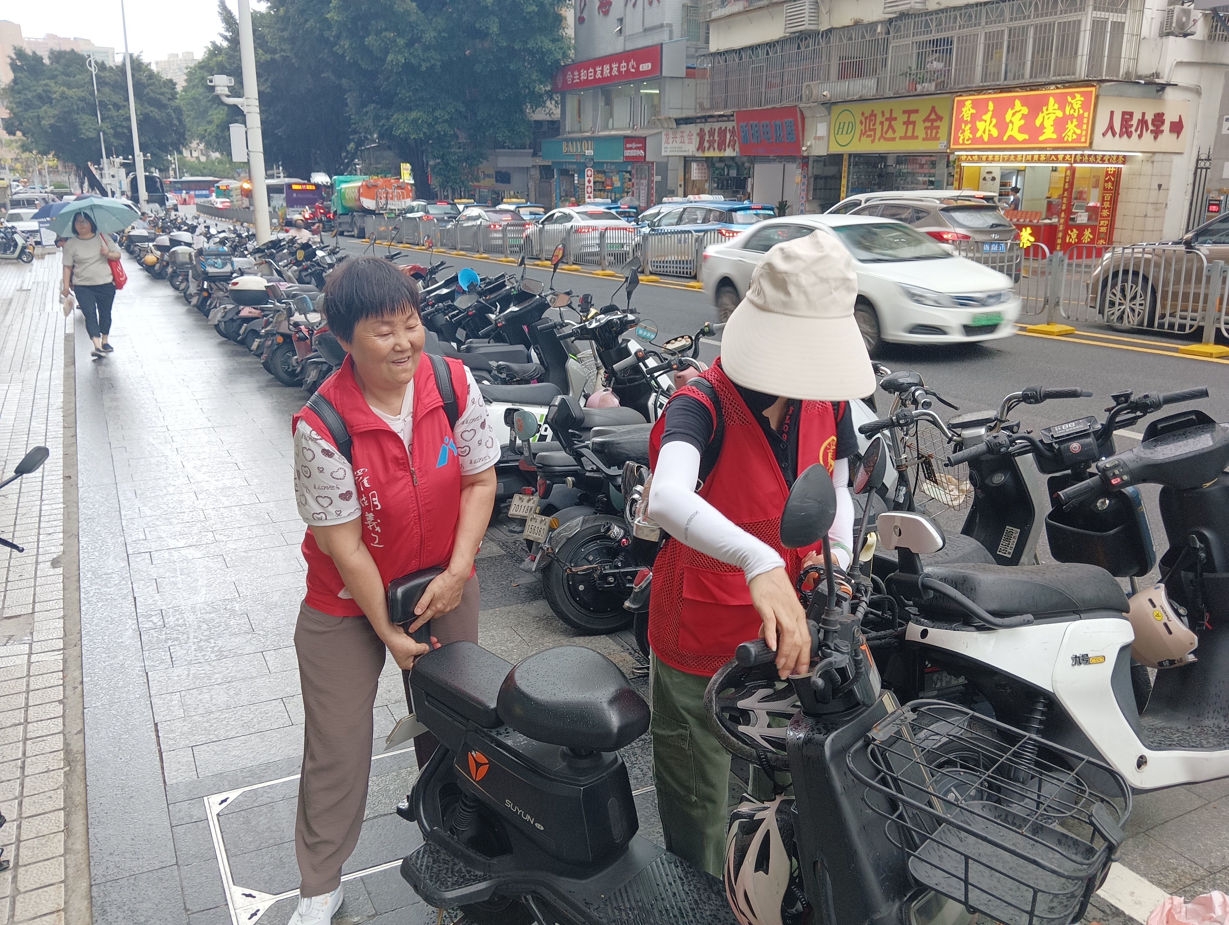 花场社区志愿者整理路面乱停放电动车